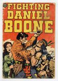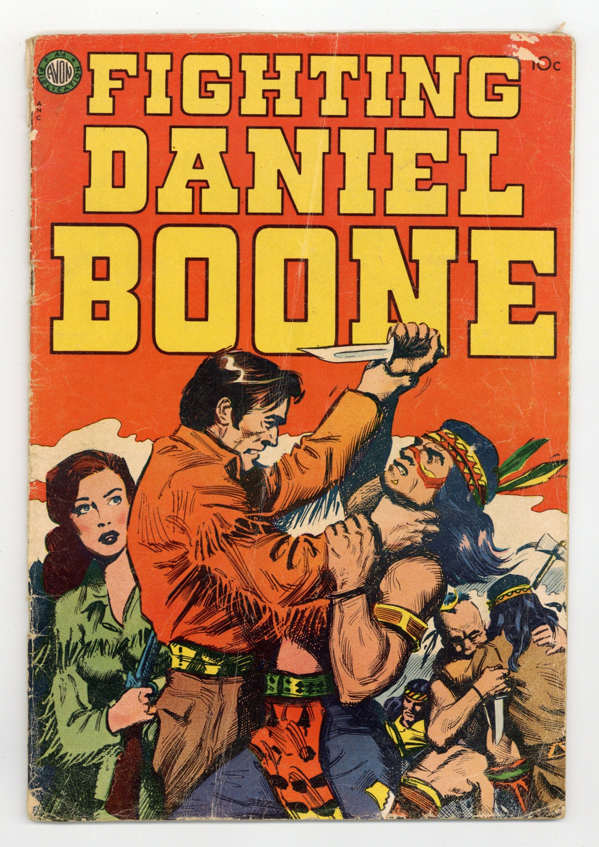 1953 edition cover (with red background and no issue number) by Everett Raymond Kinstler. Art by Everett Raymond Kinstler, Mort Lawrence and Vince Alascia. Pioneer hero Daniel Boone leads a life of adventure on the American frontier. Boone and the settlers of 19th-century America fight for land with every weapon at their disposal. Plus a backup crime story, as Wallie Norman goes from loansharking to murder. Also featuring an elegant contents page illustrated by Everett Raymond Kinstler on the inside front cover. Fighting Daniel Boone; Wallie Norman -- The Crime King! 32 pages, Full Color. Cover price $0.10.