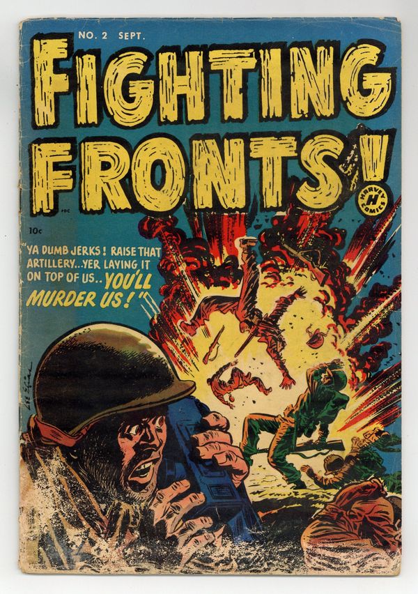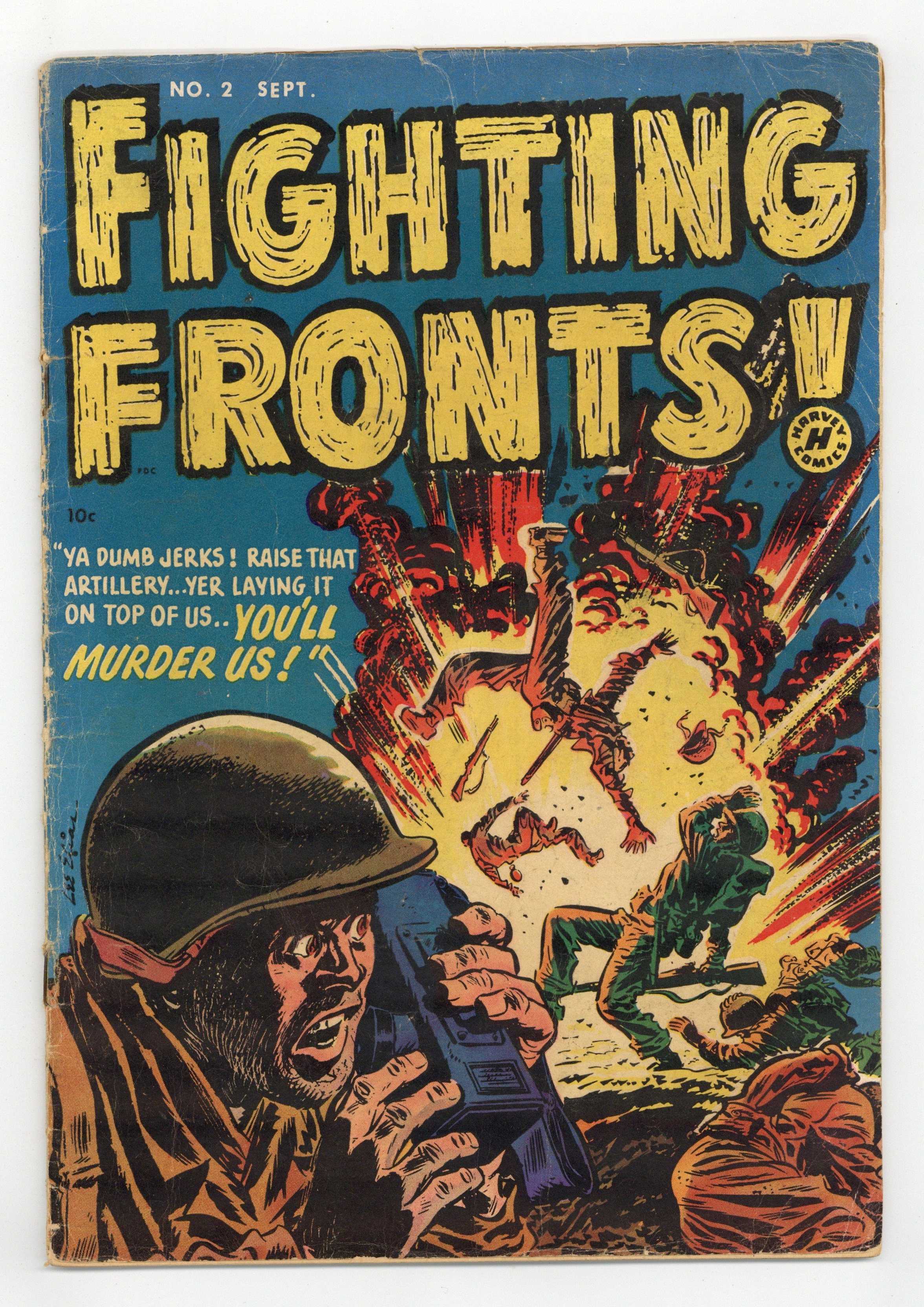 Cover by Lee Elias. Stories and art by Jack Sparling, Howard Nostrand, and Warren Kremer. Tales of war from Harvey, published as the Korean War was at its peak. A fighter pilot sees a UFO over Korea. Infantry soldiers are dangerously close to the aerial bombardment from their own side. Native American soldier Bill springs into action. On the Line!; I Saw Something From Another World; You Murdered Us; Operation Hedge-Hop; Medal of Honor; Home…Sweet Dirt; Warpath; Dead Mans Bluff; Nine Fingers. 36 pages, full color. Cover price $0.10.