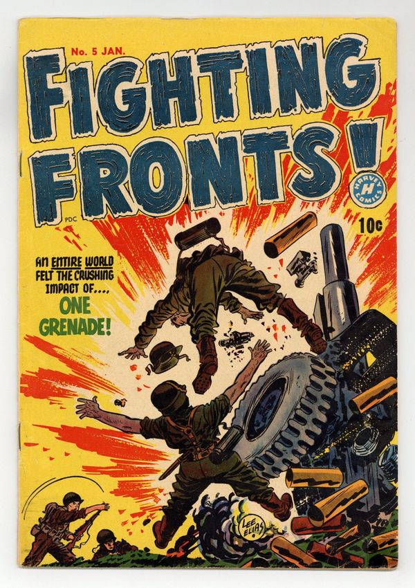 Cover by Lee Elias. Stories and art by Bill Walton and others. Tales of war from Harvey, published as the Korean War was at its peak. A soldier learns the truth about a battlefield legend. A unit's last chance for survival comes down to one hand grenade. An ordinary GI Joe learns what it takes to be called a hero. The Bullet; One Grenade!; Wake Island; Hero?; On Your Guard; Torpedo!; Roaring Ridge! Final issue of the series. 36 pages, full color. Cover price $0.10.
