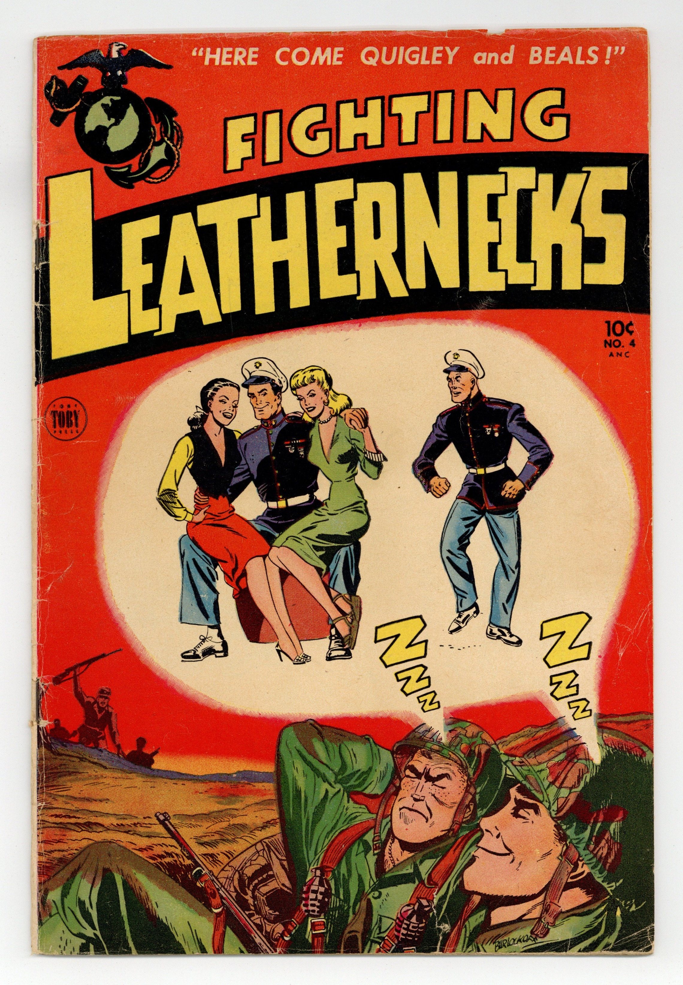 Stories and art by Vic Herman and others. Military comedy from Toby Press featuring ne'er-do-well US Marines Quigley and Beals. A diplomatic assignment to Austria is impeded by Quigley and Beals' inclination to compete for every comely woman they see, whether she's a military secretary or a sinister Russian spy. Q. and B. are assigned to protect a visiting Russian opera star with info on commie agents, but the commie agents are there too, disguised as the FBI. Marine private Gwendolyn gets all dolled-up for a formal dance, forgetting that "formal" in the military means "in uniform." Plus a selection of one-page good-girl art pin-ups from various unsigned artists - the best one yet. The Brunette Bombshell; A Night at the Opera; Crying Is For Cowards; GI Chuckles; Gils Gals; Gwendolyn. 32 pages, Full Color. Cover price $0.10.