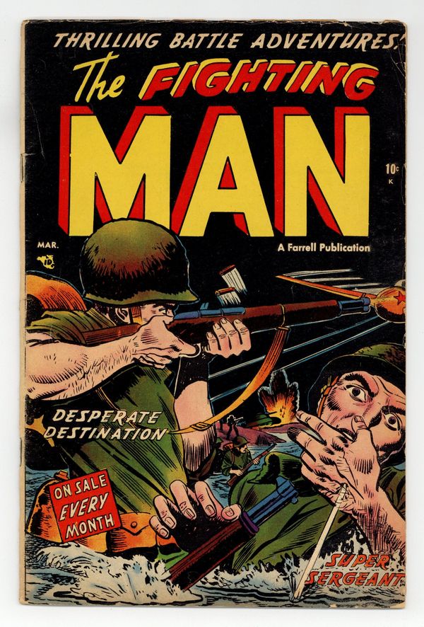 Stories by unknown. Art by Iger Shop and unknown. Thrilling battle adventures! Private Jones is an artist, but can Sergeant Bragg turn him into a soldier? Find out in "Battle Hungry"! Plus: Jim Towne is an average guy who must shake his fear and become a soldier during his first beach landing in Korea in "Desperate Destination"; Sergeant Wilcox is ordered to take his recon patrol behind enemy lines and stop the Korean advance in "The Super Sergeant"; and two soldiers must spend the night on duty in a forward listening post in "Peril Patrol"! Also: 2-page text story "Tempting Targets"! 32 pages, full color. Cover price $0.10.