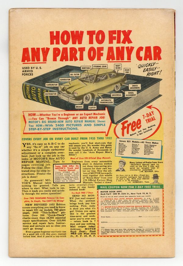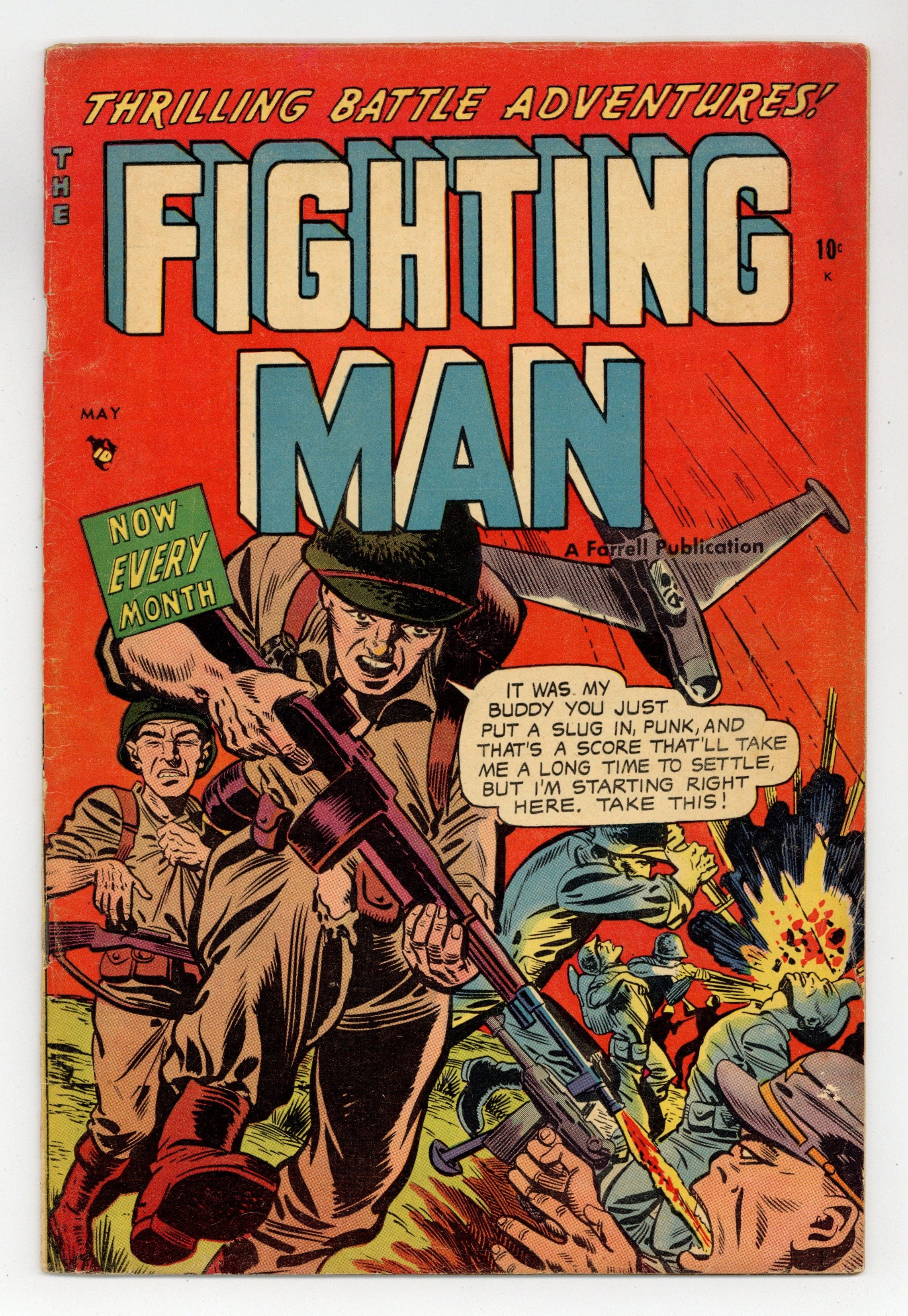 Stories by unknown. Art by unknown. Thrilling battle adventures! Bill and his raiders are tasked with destroying some AA guns behind enemy lines in Korea in "Flaming Fury"! Plus: Tex takes a chopper up on a joyride in "Sky Jeep"; Slugs and Jim get tasked with looking after a ballot box so the unit in the field can vote in the elections in "Bullets for Ballots"; and Clem wants to wear his grandfather's Rebel hat in the Korean war in "Rebel Yell"! Also: 2-page text story "This is War!" 32 pages, full color. Cover price $0.10.