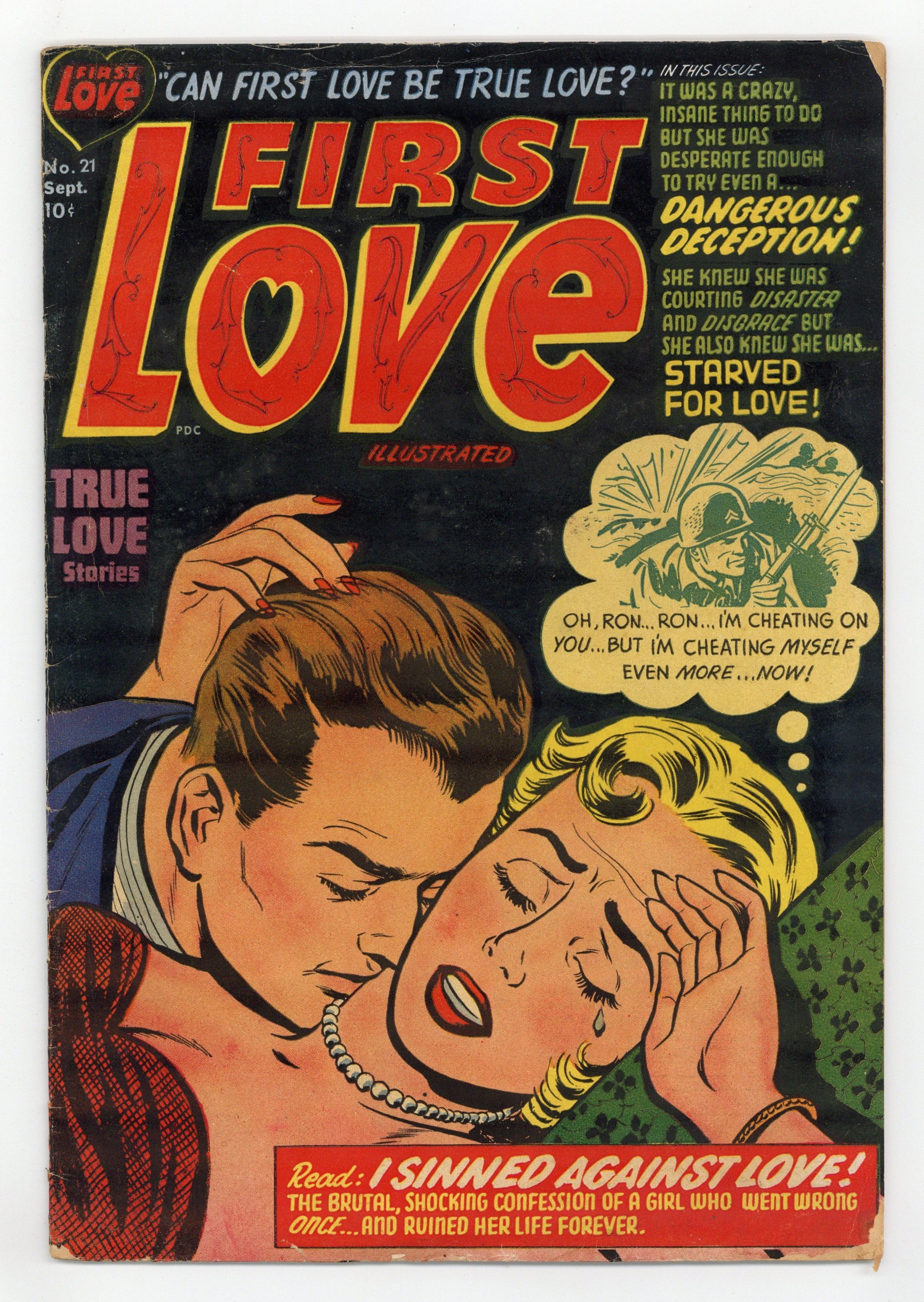 Cover art by Al Avison. "I Sinned Against Love"; Gail schemes to make her wealthy high school boyfriend Ron propose to her before hes inducted into the Army; They elope but keep it a secret from everyone; While Ron is gone, Gail gets an office job in another town and falls in love with her boss Frank. "The Luckiest Girl in Town" text story. "Dangerous Deception!", art by Tom Hickey; Secretary Ginny loves her boss Ted; She disguises herself and attends a masquerade ball so she can flirt with him; They fall in love but Ginny reveals her true identity when she helps Ted rescue valuable files from a fire that threatens their office. Strange Romantic Customs fact page. Advice to readers by Nancy Powers. "Starved for Love!", art by Bob Powell; Lauries parents are too busy to give her love and affection; Even though she doesnt love fellow student Bill, she continues to date him because he has a close-knit family and she basks in that atmosphere. "The Choice Was Mine" text story. "Fool's Paradise," art by Jack Sparling; Office worker Connie is hired as a roller derby skater and is trained by Don, but she rejects his romantic overtures to concentrate on her career; However, she makes an exception for wealthy Michael: they date and fall in love. 36 pages, full color. Cover price $0.10.