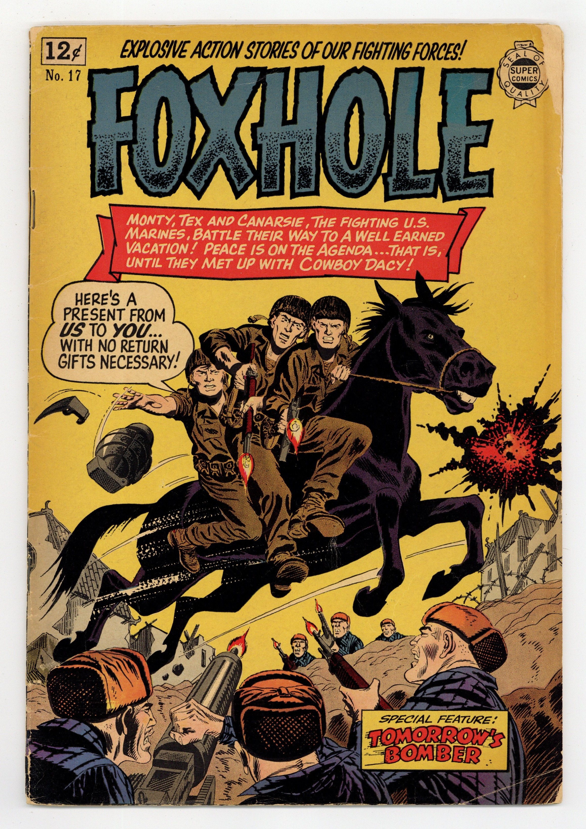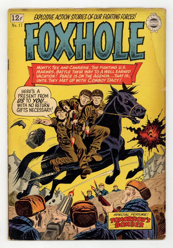 Cover by Jack Abel. Stories and art by Mel Keefer and Jack Sparling. I.W./Super reprints gritty war stories featuring the US Marine Corps. US Marine Monty Hall (no relation to the game-show host) and his buddies Tex and Canarsie try to rescue a paratrooper stuck in a tree. On a mission behind enemy lines, Marines Spike and Bat meet an old enemy, the Terrible Turk. Plus a comics history of the USMC in the early 19th century, and a speculative article about bombers of the future. Monty Hall and the Big Rhubarb!; Spike and Bat Meet The Terrible Turk; The U.S. Marines on the Shores of Tripoli; Tomorrows Bomber! 32 pages, Full Color. Cover price $0.12.