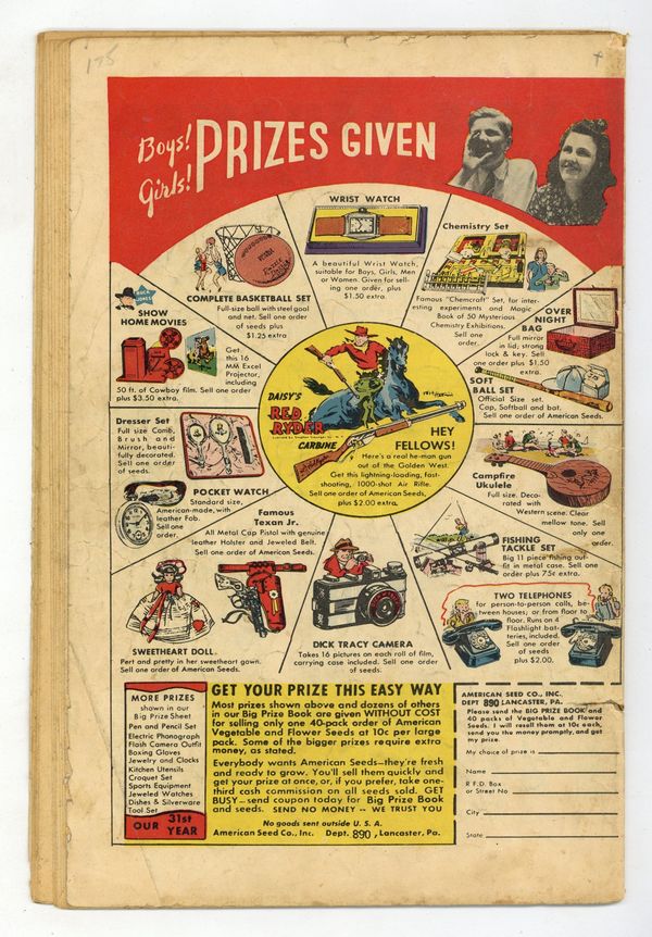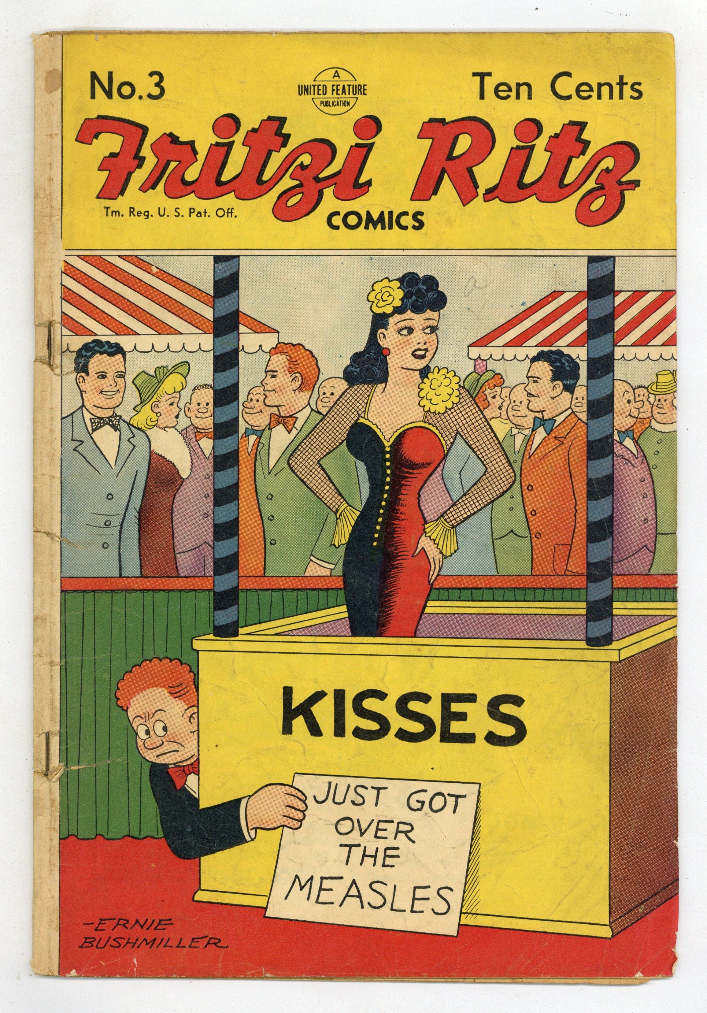 Cover by Ernie Bushmiller. Stories and art by Ernie Bushmiller, Bernard Dibble and Ernest Hix. The comic-strip adventures of aspiring model Fritzi Ritz and her boyfriend, the bumbling Phil Fumble. Fritzi was later known as "Aunt Fritzi" in the Nancy comic strip. Roadside signs distract Fritzi from her diet, in a story featuring Fritzi driving a classic 1940s roadster. Phil uses Fritzi's mirror to ogle women on the beach, in a strip that includes some 1940s comic-strip "good girl" art. In a multi-page story by "Fritzi" ghost artist Bernard Dibble, Bill Bumlin chases a runaway lottery ticket. Plus the Ripley-like Strange As It Seems by Ernest Hix. Fritzi Ritz; Bill Bumlin; Strange As It Seems. 32 pages, Full Color. Cover price $0.10.