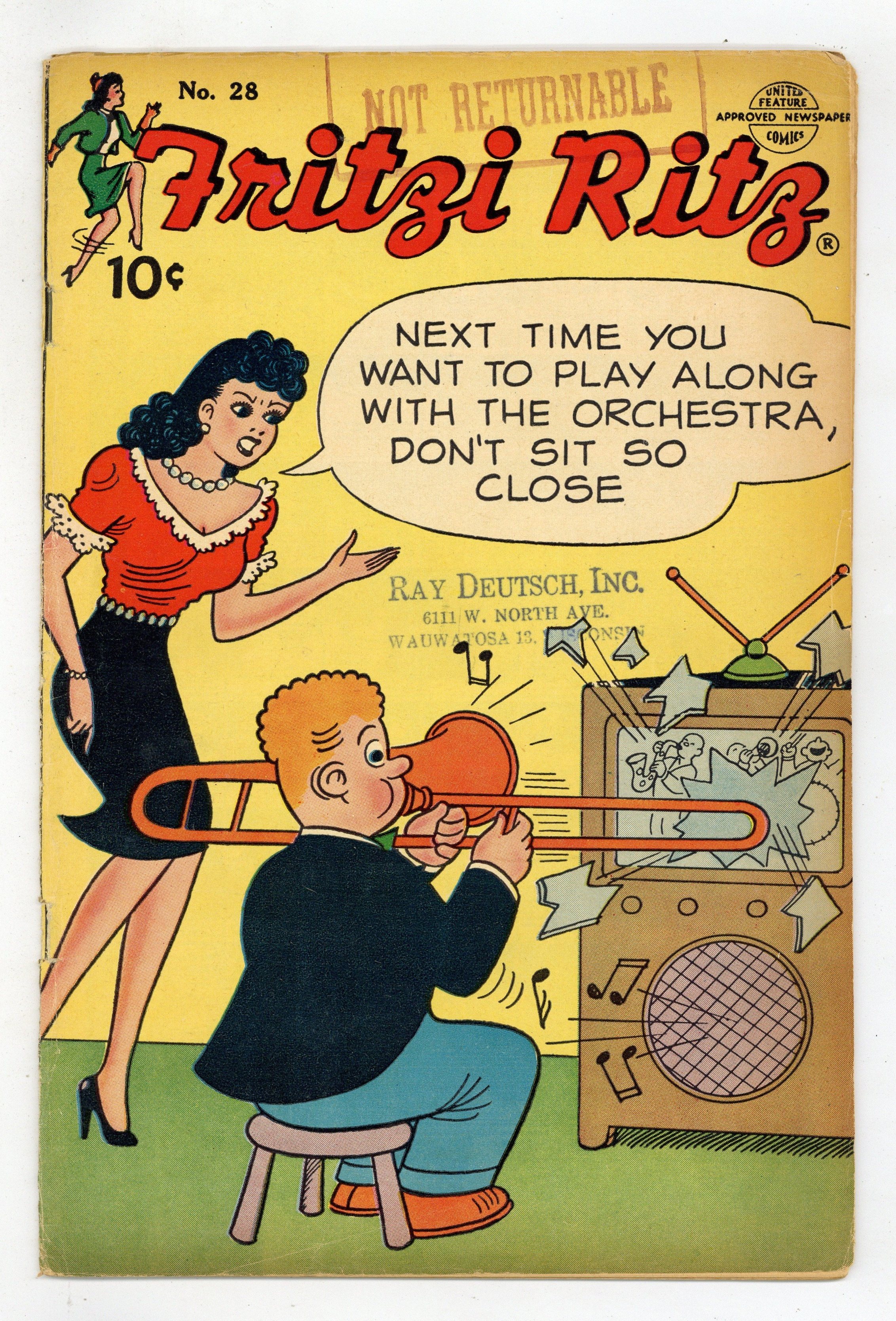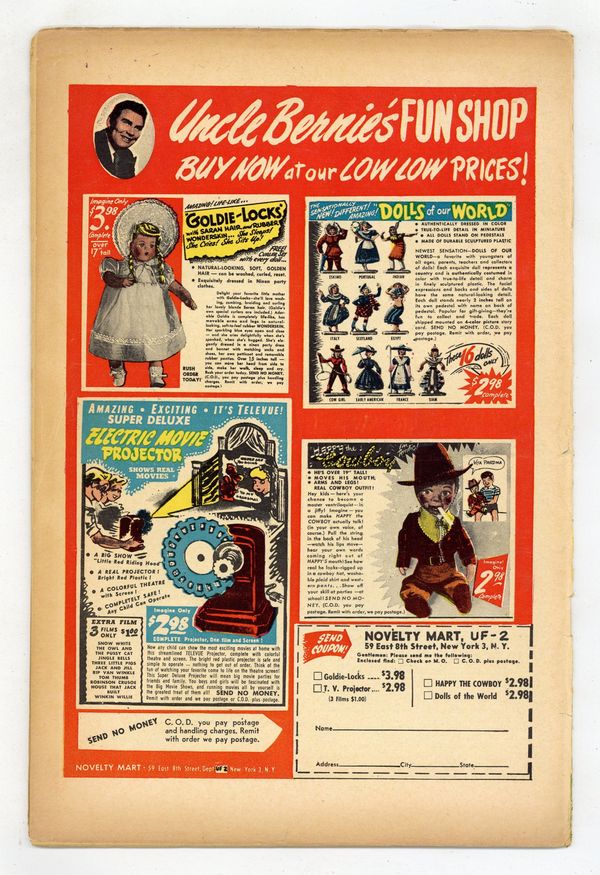 Cover by Ernie Bushmiller. Stories and art by Ernie Bushmiller, Charles Schulz, Russell Patterson, Elizabeth Woodward, and Raeburn van Buren. The comic-strip adventures of aspiring model Fritzi Ritz and her boyfriend, the bumbling Phil Fumble. Fritzi was later known as "Aunt Fritzi" in the Nancy comic strip. Fritzi's first customer at the charity kissing booth is the last one she expects. Phil is mistaken for a bank robber who looks exactly like him. One of the backup strips in the comic is Charles Schulz's Peanuts, then only in its fourth year; several daily strips are presented in full color. Plus an Abbie an' Slats strip with great art by Raeburn van Buren. Fritzi Ritz; Peanuts; Abbie an' Slats; Stamp Tips; Mamie. 36 pages, Full Color. Cover price $0.10.