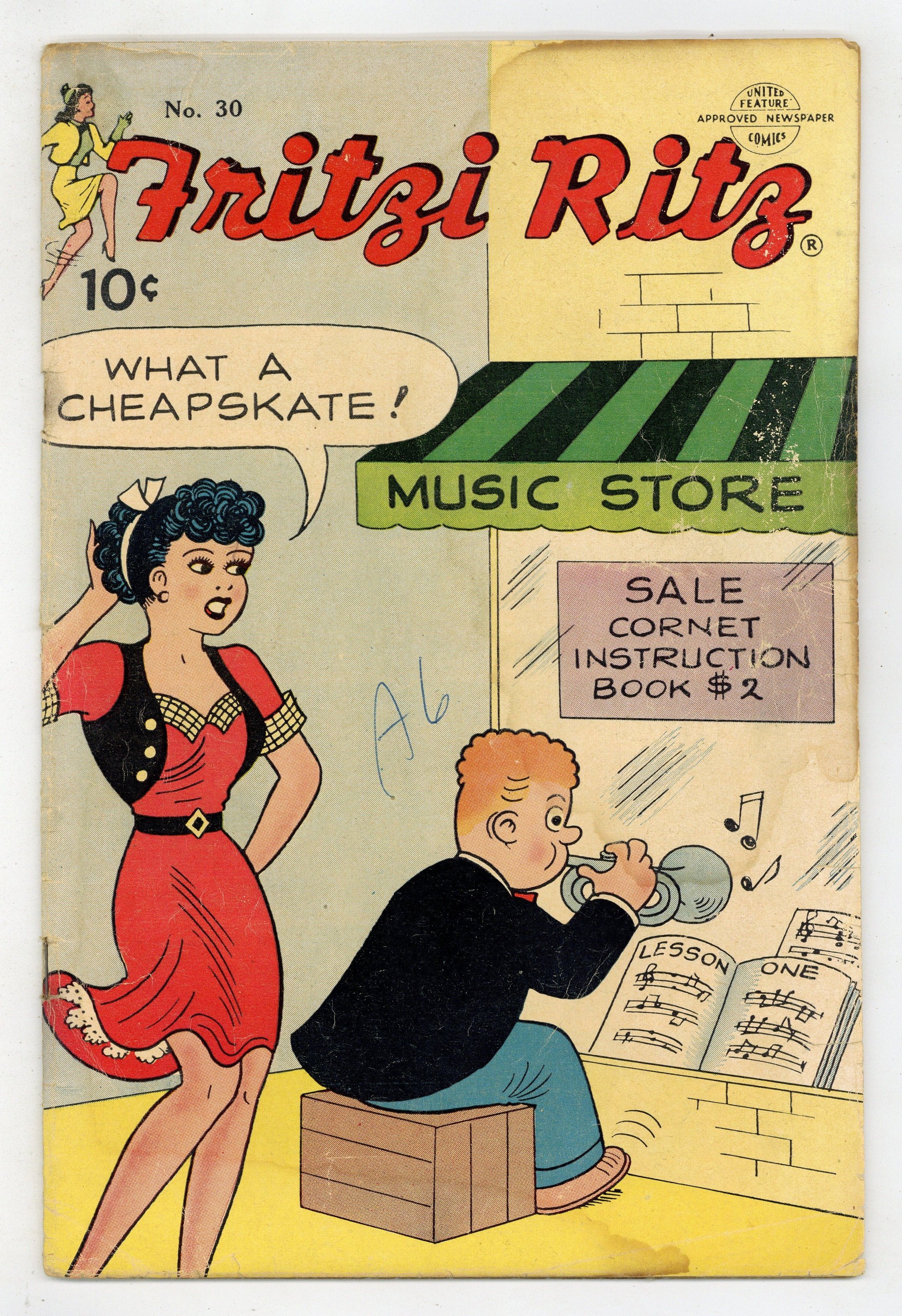 Cover by Ernie Bushmiller. Stories and art by Ernie Bushmiller, Charles Schulz, Russell Patterson, Rudolph Dirks, Elizabeth Woodward, and Raeburn van Buren. The comic-strip adventures of aspiring model Fritzi Ritz and her boyfriend, the bumbling Phil Fumble. Fritzi was later known as "Aunt Fritzi" in the Nancy comic strip. Phil and Fritzi's boring dude-ranch vacation becomes a breathless chase after Phil accidentally lassos a moose. New in town, Sue Groggins of Abbie an' Slats ill-advisedly takes a ride from notorious lecher "Gropeworth Snootingham." One of the backup strips in the comic is Charles Schulz's Peanuts, then only in its fourth year; several daily strips are presented in full color. Other backup strips include the Katzenjammer Kids and Russell Patterson's Mamie. Fritzi Ritz; Peanuts; The Captain and the Kids; Abbie an' Slats; Stamp Tips; Mamie. 32 pages, Full Color. Cover price $0.10.