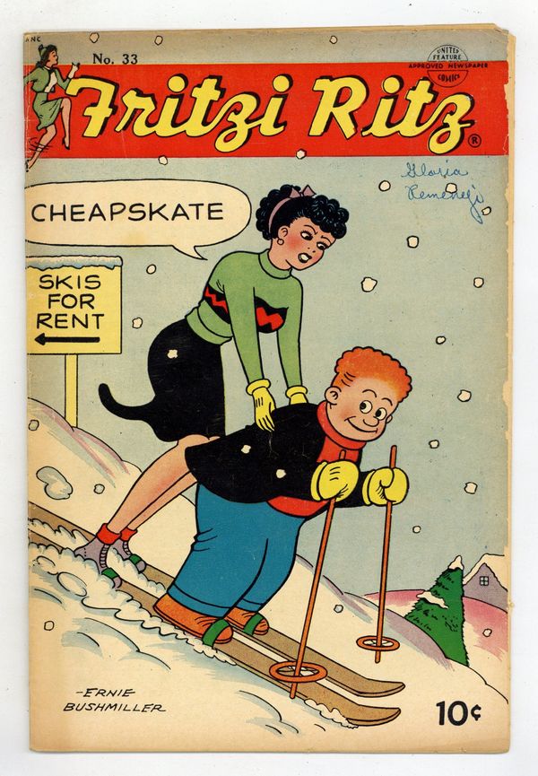 Cover by Ernie Bushmiller. Stories and art by Ernie Bushmiller, Charles Schulz, Al Capp, Russell Patterson, Elizabeth Woodward, and Elsie Hix. The comic-strip adventures of aspiring model Fritzi Ritz and her boyfriend, the bumbling Phil Fumble. Fritzi was later known as "Aunt Fritzi" in the Nancy comic strip. Fritzi and Phil are mystified after a strange figure hands Fritzi a package and runs away. Fritzi tries to clean up after the neighbor kid fills her yard with paper airplanes. One of the backup strips in the comic is Charles Schulz's Peanuts, then only in its fifth year; several daily strips are presented in full color. Other backup strips include Al Capp's Li'l Abner and the Ripley-like Strange As It Seems by Elsie Hix. Fritzi Ritz; Peanuts; Li'l Abner; Stamp Tips; Strange as It Seems. 32 pages, Full Color. Cover price $0.10.