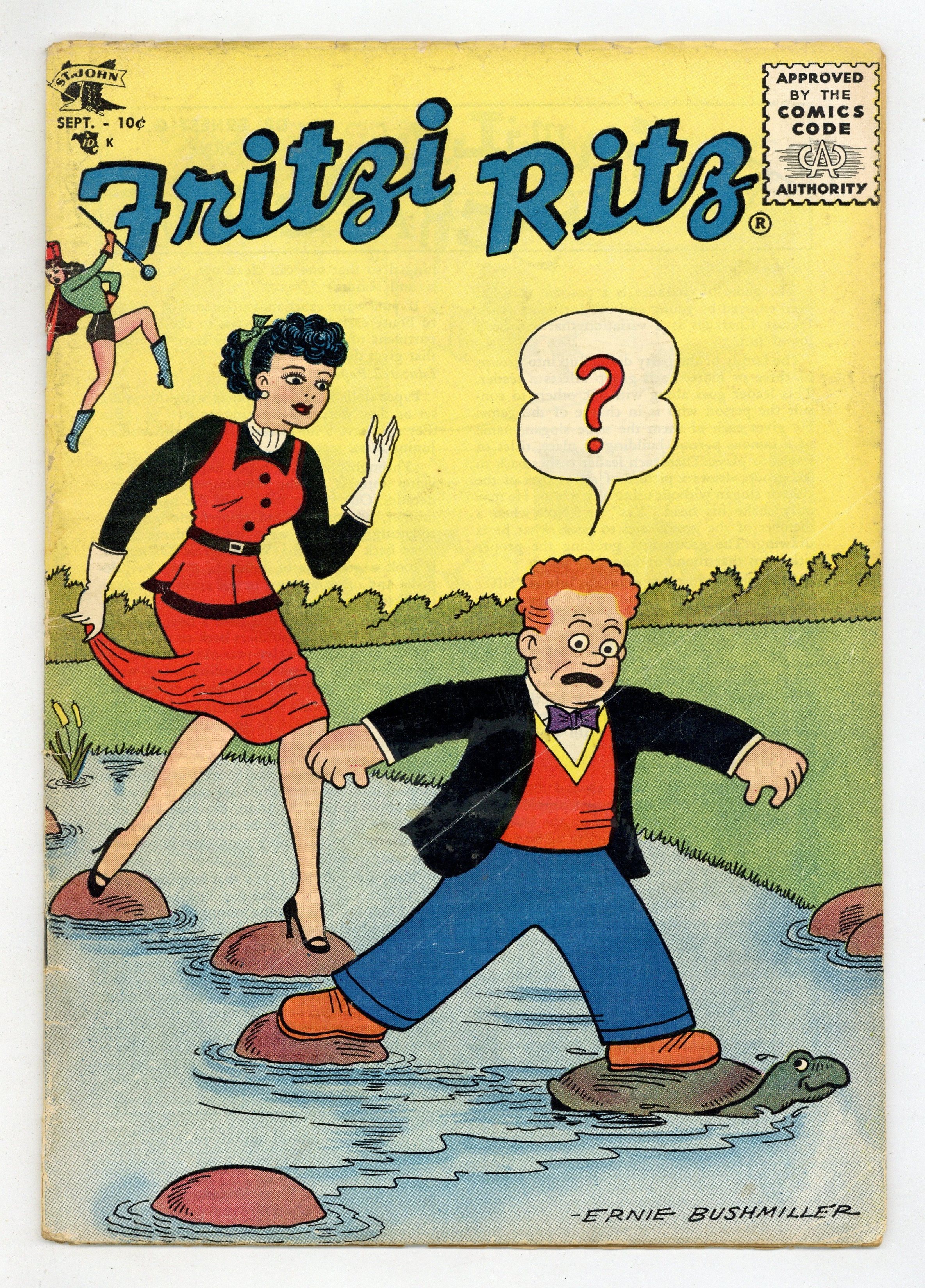 Cover by Ernie Bushmiller. Stories and art by Ernie Bushmiller, Charles Schulz, Ernest G. Osborne and Leonard Sansone. The comic-strip adventures of aspiring model Fritzi Ritz and her boyfriend, the bumbling Phil Fumble. Fritzi was later known as "Aunt Fritzi" in the Nancy comic strip. Phil finds a way to keep Fritzi's cat from leaving the yard. A strangely prescient strip has Fritzi wearing a face mask (with lipstick). Lucy assumes the worst when she finds a love poem in Wally's schoolbook. One of the backup strips in the comic is Charles Schulz's Peanuts; several early strips are presented, going back to when Lucy was a wide-eyed toddler. Other backup strips include the Dennis the Menace-like Willie. Picture Charades; Fritzi Ritz; Willie; Peanuts; Lucy. 32 pages, Full Color. Cover price $0.10.