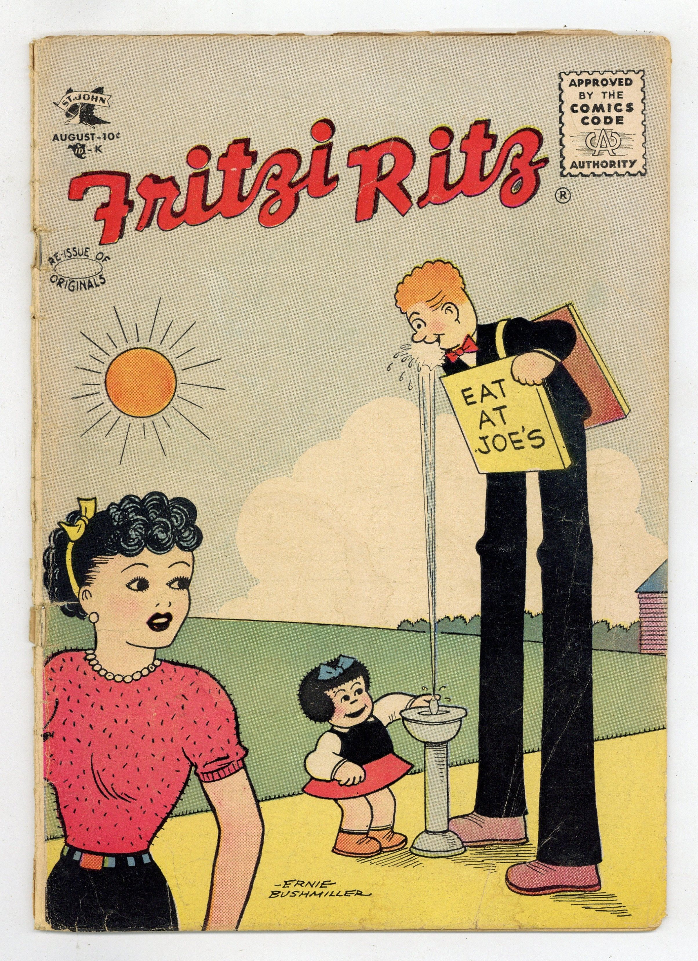Cover by Ernie Bushmiller. Stories and art by Ernie Bushmiller, Charles Schulz, Ernest G. Osborne, and Leonard Sansone. The comic-strip adventures of aspiring model Fritzi Ritz, her boyfriend Phil Fumble, and her precocious niece Nancy. Fritzi meets her exact double, but it's Phil who's beside himself. Fritzi tries to get Nancy to pick up her things. Fritzi checks into a hotel where everything is big, except the room. Plus early Peanuts strips by Charles Schulz, and the Dennis the Menace-like Willie. The Family Scrapbook; Fritzi Ritz; Willie; Peanuts; Nancy. 32 pages, Full Color. Cover price $0.10.