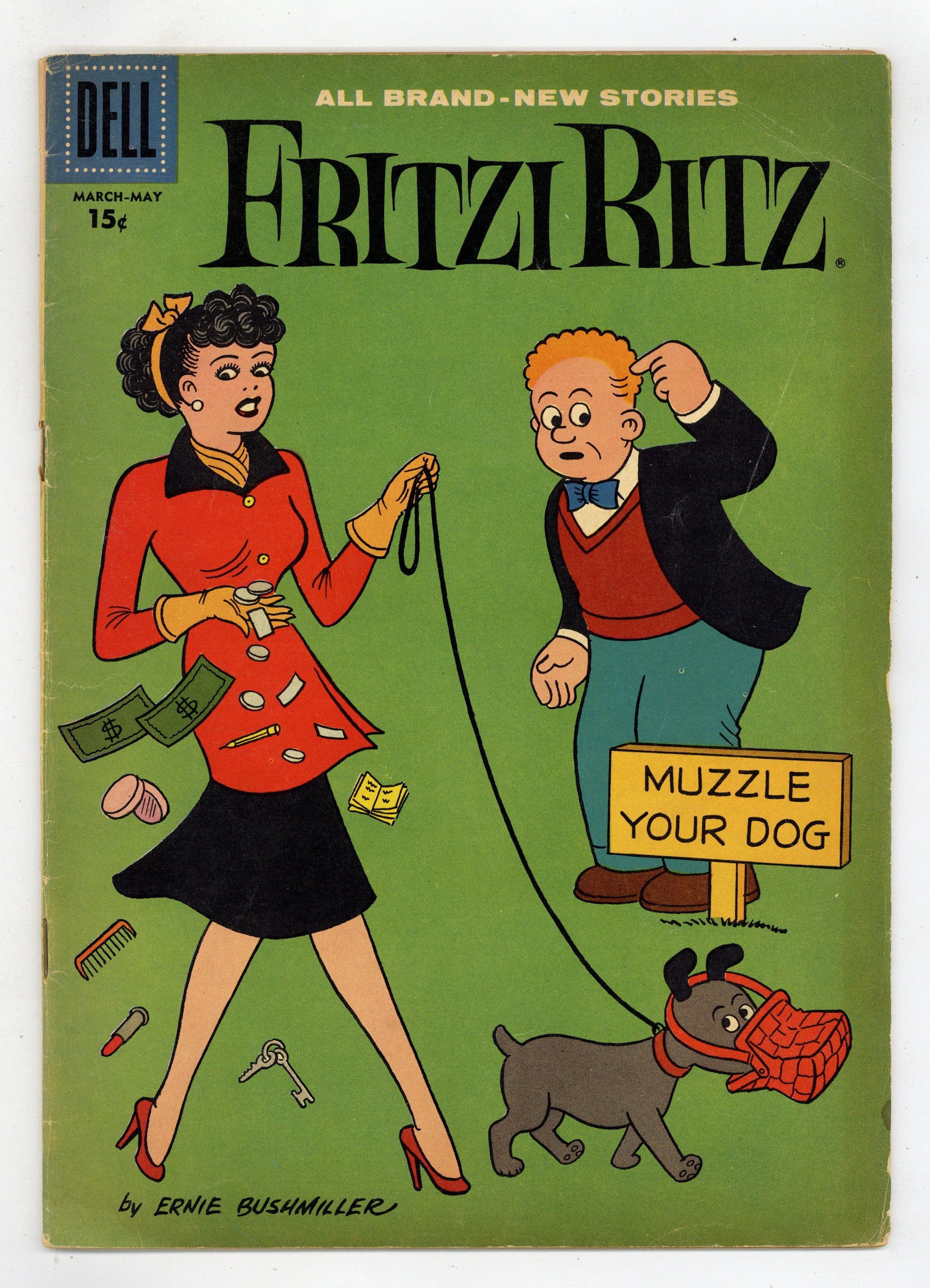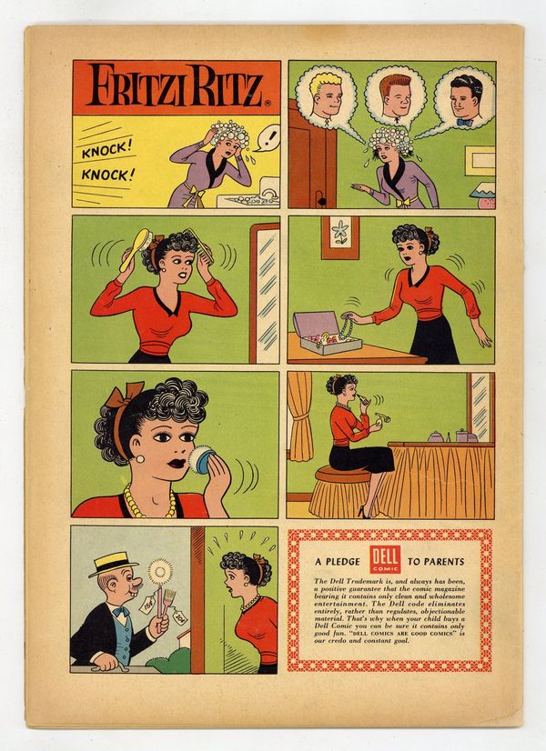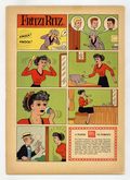 Cover by Ernie Bushmiller. Stories and art by Jim Sasseville and others. The comic-strip adventures of aspiring model Fritzi Ritz, her boyfriend Phil Fumble, and her precocious niece Nancy. A fly-by-night acting school convinces Phil that he can be a movie star. Fritzi's grocery cart gets away from her and rolls downhill, leading to a frantic chase across town. Phil and Fritzi go on a scavenger hunt, but police think they're vandals stealing city property. Plus a Peanuts story by Charles Schulz's friend/understudy Jim Sasseville. Footlight Fever; Dinner a la Cart; Scavenger Hunt; Night Patrol; Knit-Wits; Peanuts; Many Happy Returns. 32 pages, Full Color. Cover price $0.10.