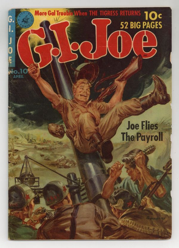 Painted cover by Norman Saunders. Stories and art by Everett Raymond Kinstler, Mike Suchorsky, and Irv Novick. Two #10s exist. See previous Ziff Davis Series (1950-51) for the other one. Neither a tie-in with the later toy line/cartoon nor a grim war comic, this first-gen GI Joe focused on lighthearted tales of military life. The Yardbirds, featuring Pvts. Windy and Whitey, was straight-up comedy of the Beetle Bailey/Sad Sack variety. Chip runs into old flame Harriet on the Korean front, but now he's a private and she's a lieutenant, in romance-flavored war story. Beautiful enemy agent Lilith the Tigress returns, in a story with Milton Caniff-ish art by Irv Novick. A Southern GI captured by the enemy tries to explain the US Civil War to a North Korean colonel. G.I. Facts and Figures; Hoosier Farmboy; The Eagle Screams; The Tigress Returns; Korean Clipper; Betsy Ross Bags a Colonel; The Battle of Wits; The Colonels Girl; Weepys Christmas; Forty Minutes with Destiny. 48 pages, Full Color. Cover price $0.10.