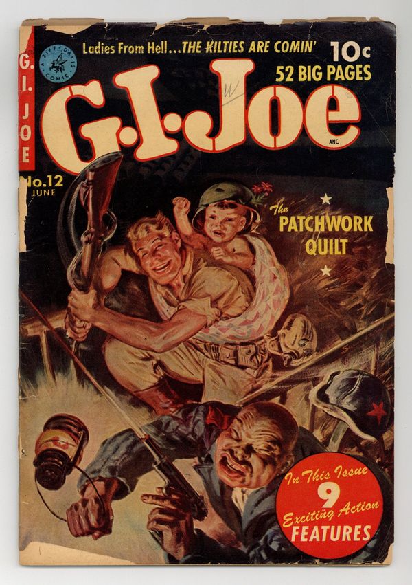 Tags: G.I. JoePublished Jun 1952 by Ziff Davis.$80.002 #12s exist. See previous Ziff Davis Series (1950-51). Painted cover art by Norman Saunders. With Love, Mom! starring G.I. Joe. The Patchwork Quilt starring G.I. Joe. Knit One, Fire Two starring G.I. Joe. The Born Leader starring Pvt. Bragg. Sleeping Beauty starring G.I. Joe, art by George Olesen. Next Week East Lynne starring G.I. Joe, art by Henry Sharp. The Kilties Are Comin' starring G.I. Joe, art by Mike Suchorsky; Baker Company makes a striking contribution to amity between the United Nations when they help restore the morale of His Majesty's Own Highlanders, who have been suffering from dry rot. 52 pgs. $0.10. Cover price $0.10.