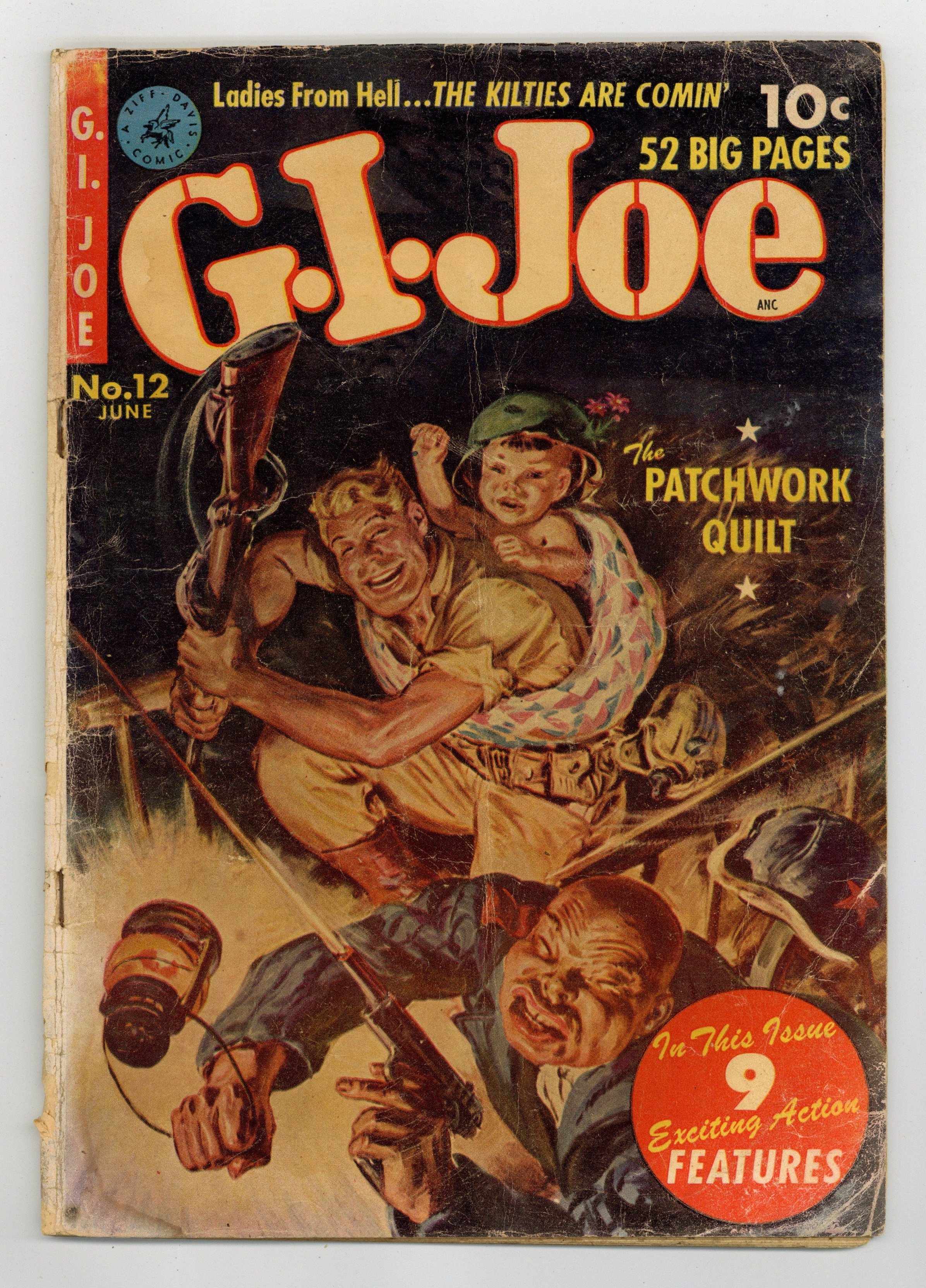 2 #12s exist. See previous Ziff Davis Series (1950-51). Painted cover art by Norman Saunders. With Love, Mom! starring G.I. Joe. The Patchwork Quilt starring G.I. Joe. Knit One, Fire Two starring G.I. Joe. The Born Leader starring Pvt. Bragg. Sleeping Beauty starring G.I. Joe, art by George Olesen. Next Week East Lynne starring G.I. Joe, art by Henry Sharp. The Kilties Are Comin' starring G.I. Joe, art by Mike Suchorsky; Baker Company makes a striking contribution to amity between the United Nations when they help restore the morale of His Majesty's Own Highlanders, who have been suffering from dry rot. 52 pgs. $0.10. Cover price $0.10.