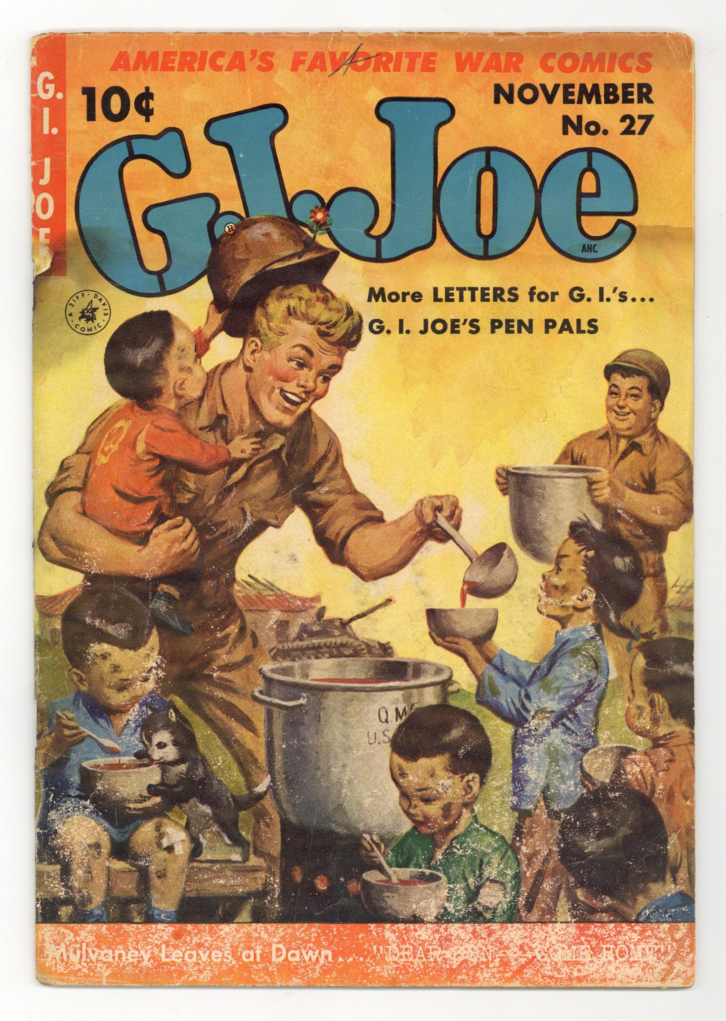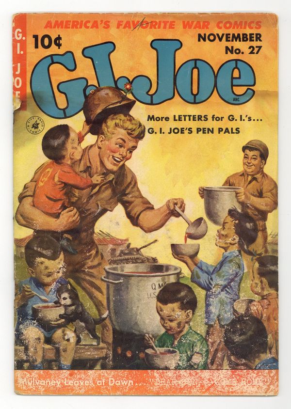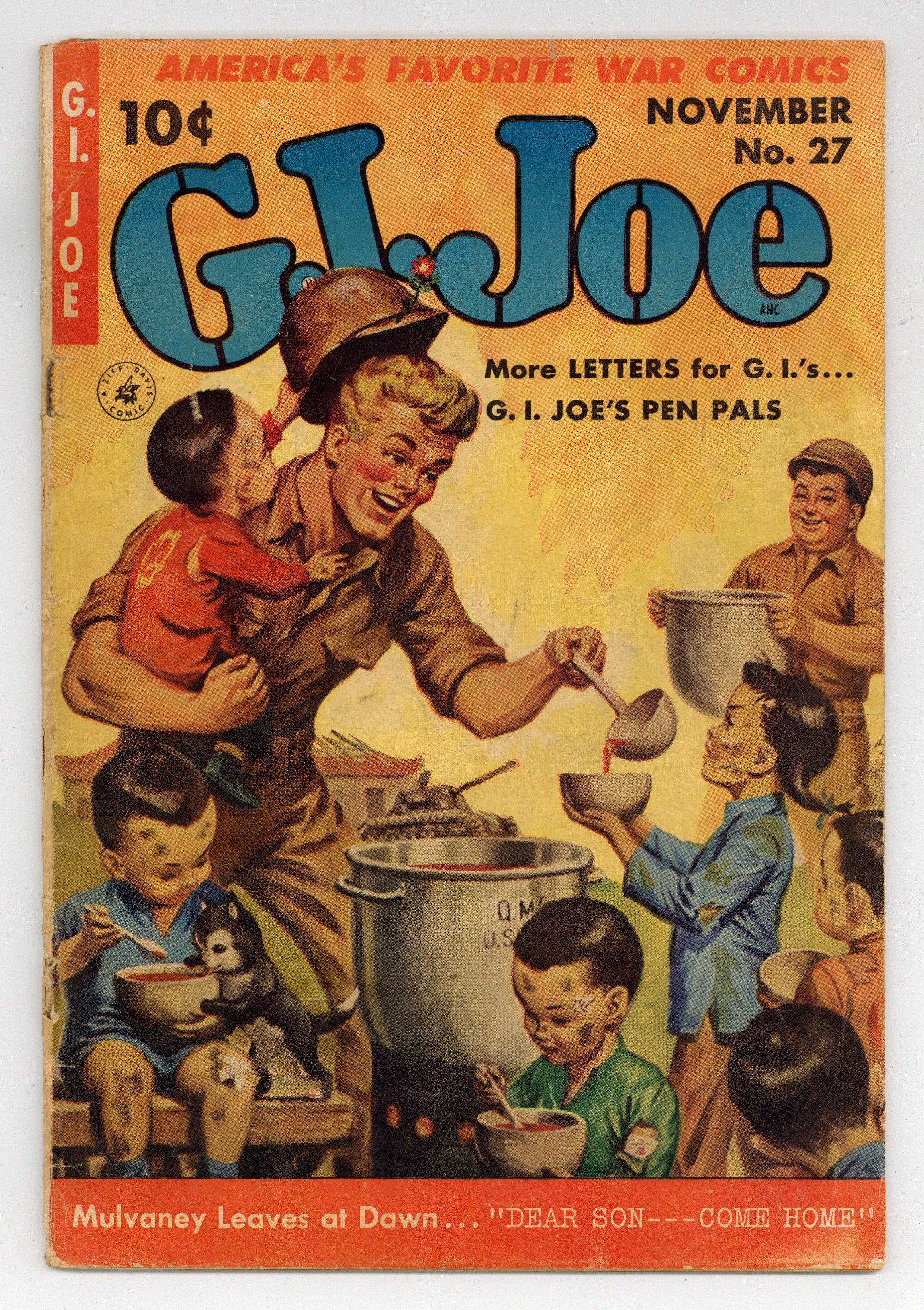 Painted cover art by Clarence Doore. The Massacre at Ku-Shi Bridge starring G.I. Joe, pencils by Irv Novick. Oh, Babe! starring G.I. Joe, art by Mike Suchorsky; Sgt. Mulvaney helps Pvt. Robbins with writing a letter. Eager Beaver starring Buddies, art by Ernest Schroeder. Dear Son, Come Home starring G.I. Joe, art by Mike Suchorsky; Sgt. Mulvaney considers going home and helping his old parents. Reserved- G.I.'s Only humor page by Jack O'Brien. 36 pgs. $0.10. Cover price $0.10.