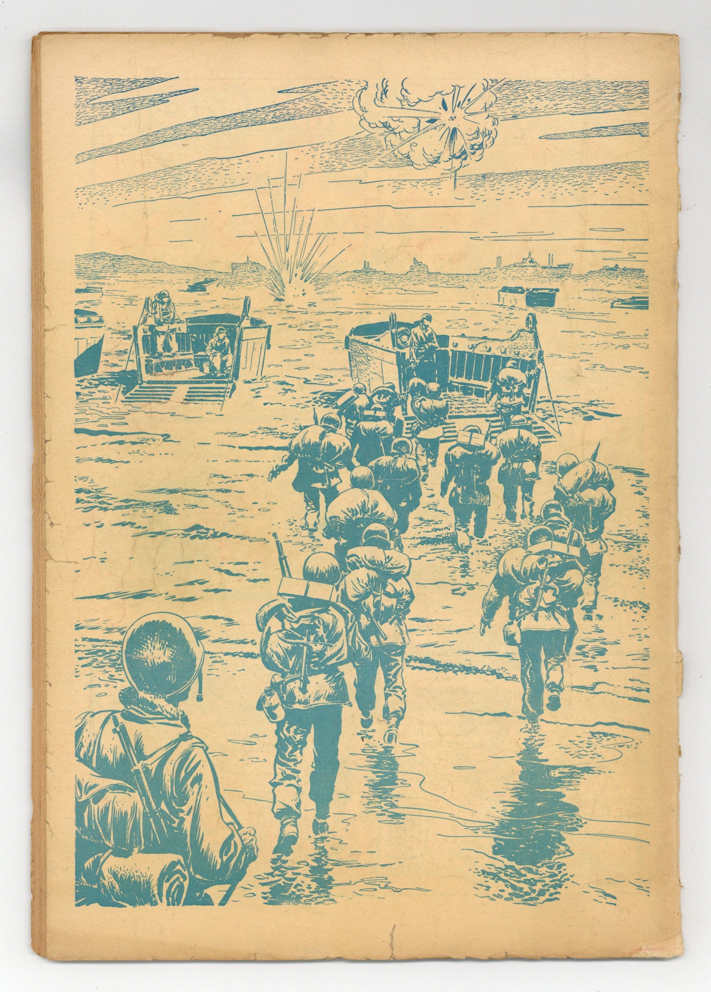 Painted cover art by Clarence Doore. Service Fun humor page by Vic Martin. Ugly Otis starring G.I. Joe, pencils by Irv Novick; Alvin Otis was far from handsome, and to make matters worse, he was far from intelligent. What a Picnic starring The Yardbirds, pencils by Dan DeCarlo [as DeCarlo-Lepick], inks by Rudy Lapick [as DeCarlo-Lepick]; The Yardbirds and their girls are on a picnic in a dummy village used for target practice. Helmet 779, art by Mike Suchorsky; The story of a helmet with the number 779, and its users. Helping Hand starring Pvt. Dopey, art by Vic Martin. The Reluctant Warrior starring G.I. Joe. 36 pgs. $0.10. Cover price $0.10.