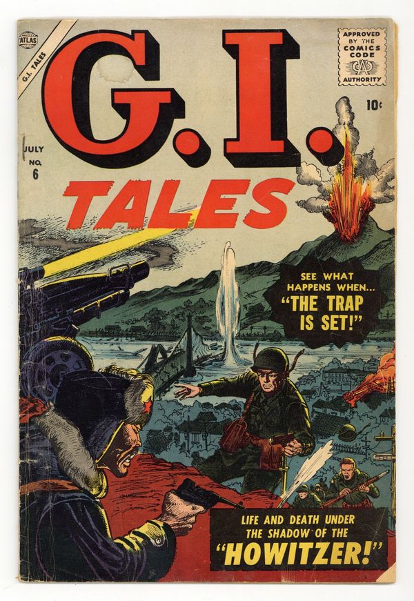 $47.50Final issue of the series. "Howitzer!" (art by Gene Colan), "Strike at Zero Hour" (art by Joe Orlando), "Wall of Fire," "Wounded in Action" (art by George Woodbridge), and "The Trap is Set!" (art by Bob Powell), plus a two-page text story, "War in the Swamp." Cover price $0.10.