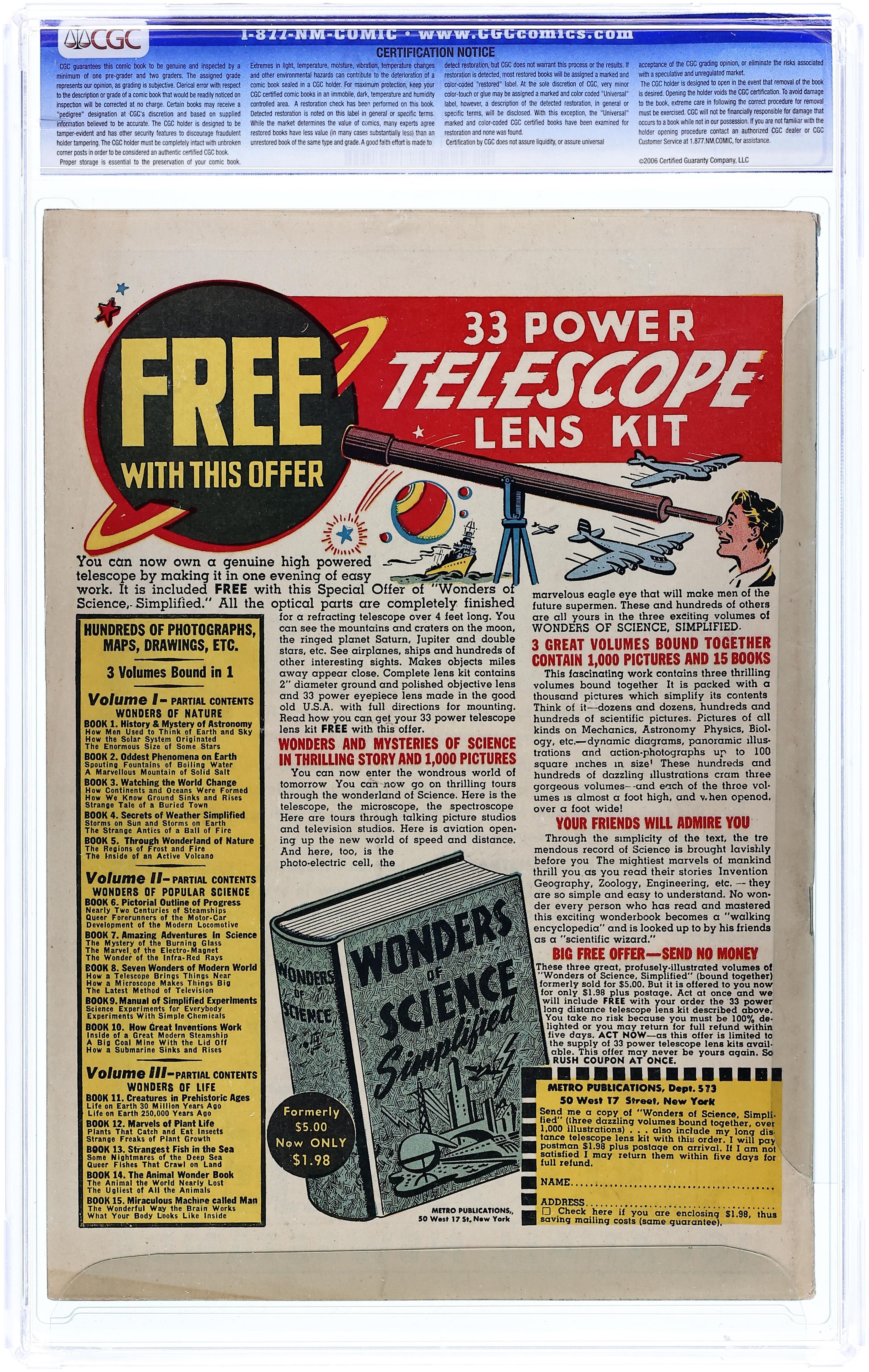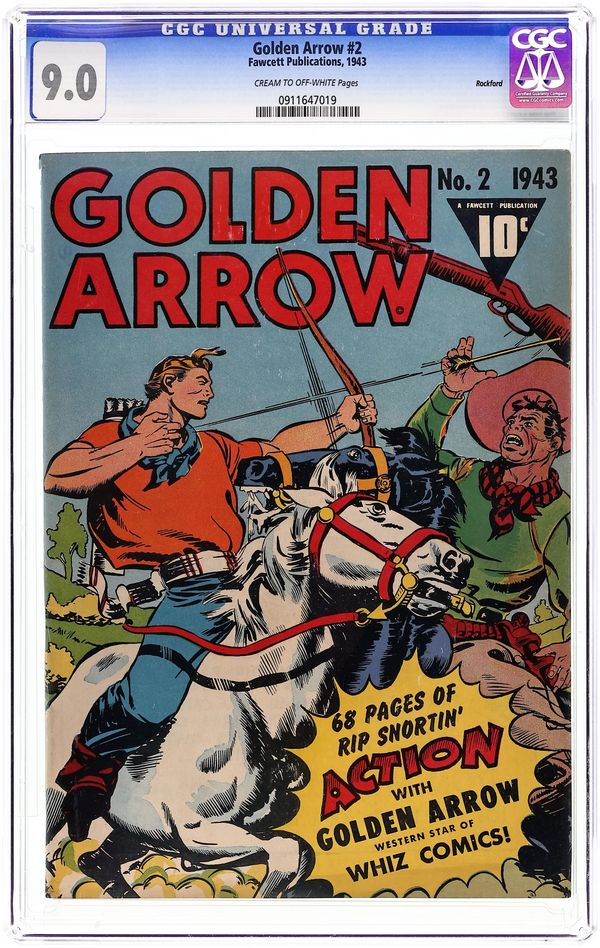 Heroic archer Golden Arrow uses gold-tipped arrows and his horse White Wind to battle injustice. Golden Arrow battles lumber rustlers in the forests of the Pacific Northwest. Outlaws frame Golden Arrow for murder and give his horse "loco weed," (!) so it seems that even his horse is crazy. A mysterious figure in medieval armor called the Knight Hawk wants the map to long-lost Spanish treasure. A Saga of the North Woods; Death Rides the Badlands; The Sign of the Killer; Golden Arrow Fences the Knight Hawk; Cousin Egbert: A Good Guy in the Badlands; The Dread Secret of Misty Valley. 64 pages, Full Color. Cover price $0.10.
