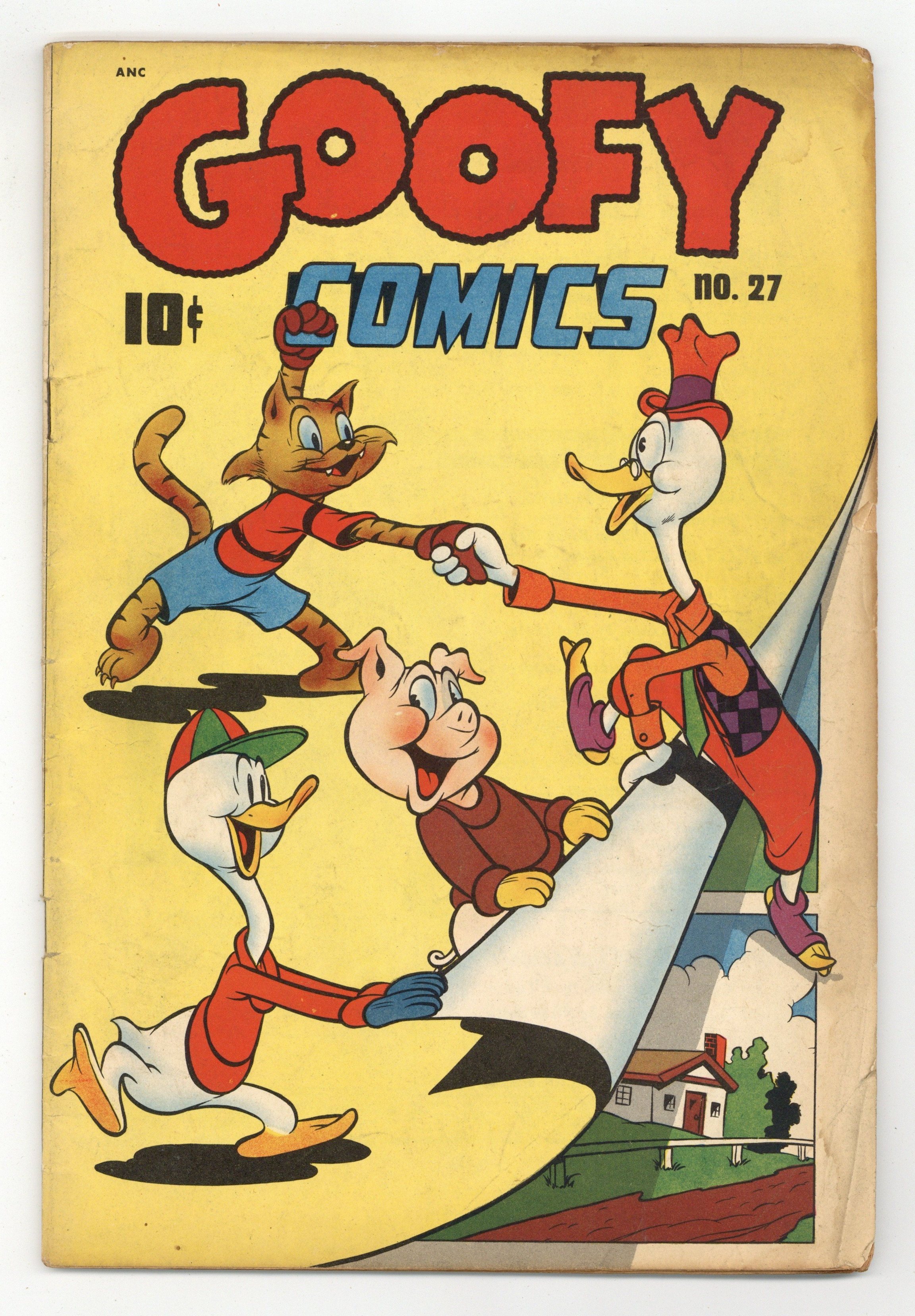 $23.00Contains three Frank Frazetta illustrations. Frazetta illustrations appear in sixteen consecutive issues of Goofy Comics (1943 Nedor/Standard) (#20-#35) and in eighteen consecutive issues of companion title Happy Comics (1943) (#20-#37). Contains funny animal stories. In order of appearance: "Goofy Gander in the Land of the Wishing Well"; "Uncle Pigly Gets the Bird!" by Vincent Fago; "Hubert" by Allan Hubbard; "Wilbur Fox" story by Hubie Karp, art by Lynn Karp; "Tooter"; "Goofy Gander"; "Li'l Thomas Hippopot" by Jack Bradbury; "Uncle Pigly"; and "Burton" art by Harris Steinbrook. Illustrated text stories: "The Reckless Horse: This Galloping Steed Kept Running Into Trouble!" by Lily K. Scott, two illustrations by Frank Frazetta; and "Lonnie the Lone Wolf: A Boastful Animal Finally Learns His Lesson!" by Betty Cummings, illustration by Frank Frazetta. 52 pages. Full color. Cover price $0.10.