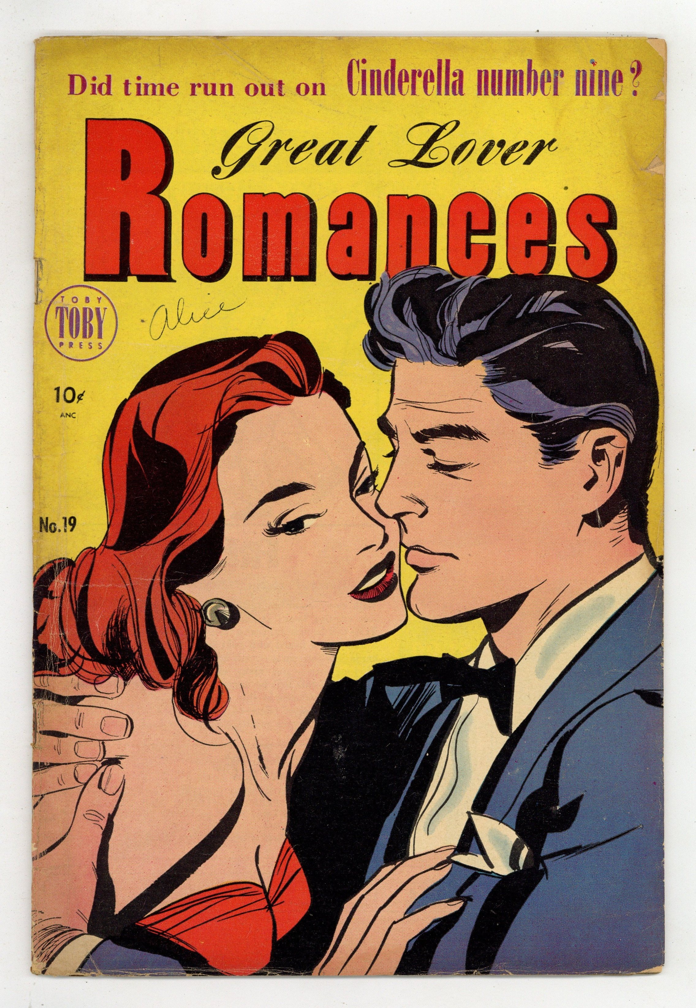 Stories and art by Art Peddy, Jack Abel, Sid Lazarus, Rudy Cristiano and Myron Fass. Romantic drama from Toby Press. Poor manicurist Julie dresses up fancy and sneaks into a ball, and falls in love with handsome hotel heir George. Lonely librarian Lorraine faces conflict with her uptight supervisor when she devotes a shelf in the stacks to love. A comics biography of Rudolph Valentino. Plus an illustrated version of a classic Romantic poem by Percy Bysshe Shelley, " Love's Philosophy." Cinderella #9; Will You Please Not Marry Me?; The Love Shelf!; Too Smart for Love!; Slightly Perfect; Love's Philosophy; Great Lovers: Rudolph Valentino. 32 pages, Full Color. Cover price $0.10.