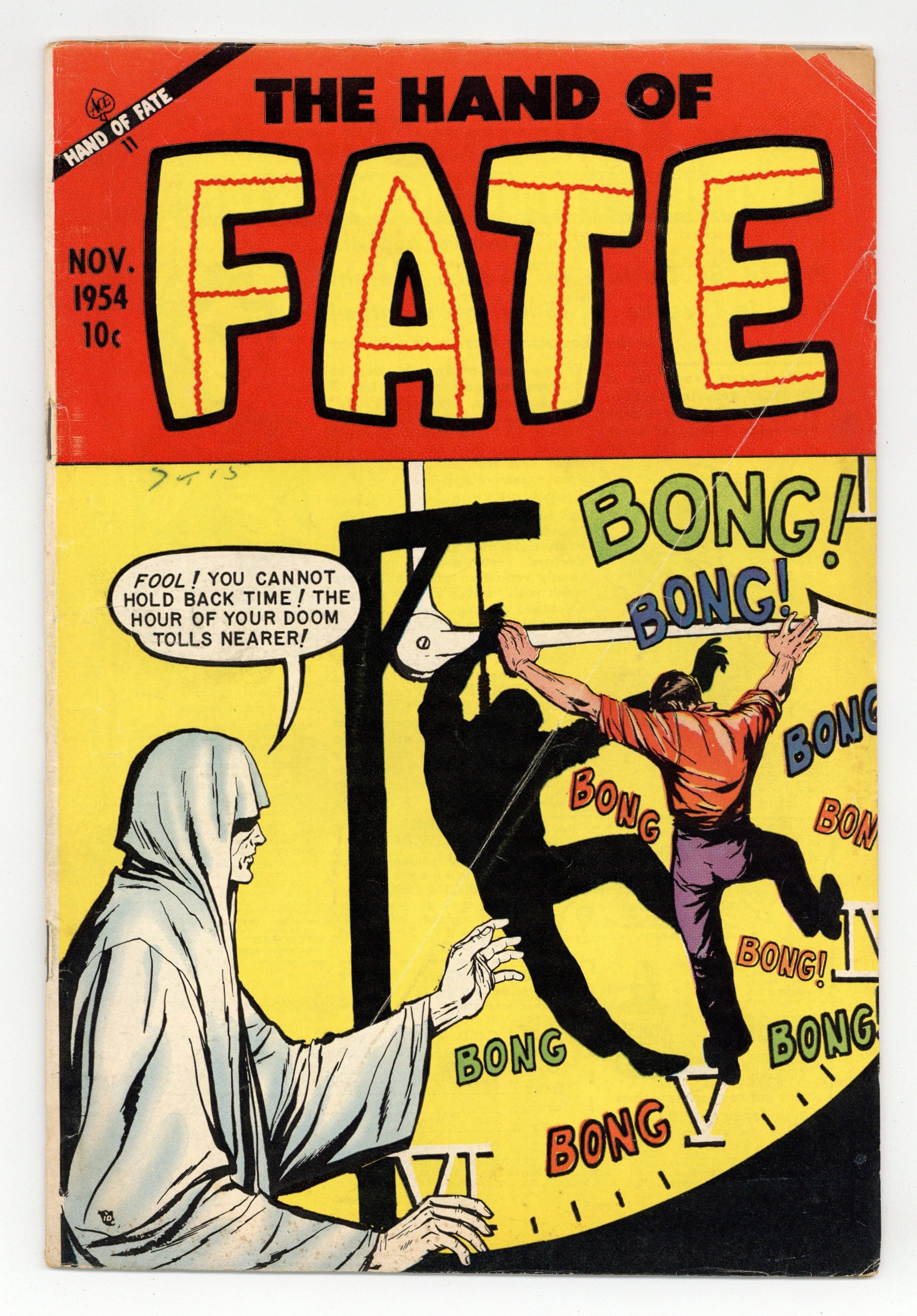 Who'd Believe Kasimir Raades? starring Fate, art by Ken Rice; Scientist Kasimir Raades develops an elixir of eternal youth and is full of best intentions, using this agent to help his aged friends first; They sadly die after some days, the elixir has to be improved. Big Top Nightmare, art by Lin Streeter; Mysterious Countess Barovna joins the circus; She is an age-old vampire and kills off all the other acts to be the main act. Death Wears No Face starring Fate, art by Lou Cameron; Combat correspondent Alec North is the sole survivor of a patrol running into trouble in Korea; He should have died, too, but can cheat Death and Fate. Trial by Ghost Light, pencils by Ken Rice; Playboy Weston is convicted and executed for a murder he didn't commit; The district attorney Dexter knew of his innocence, but used the case to become governor. 36 pgs. $0.10. Cover price $0.10.