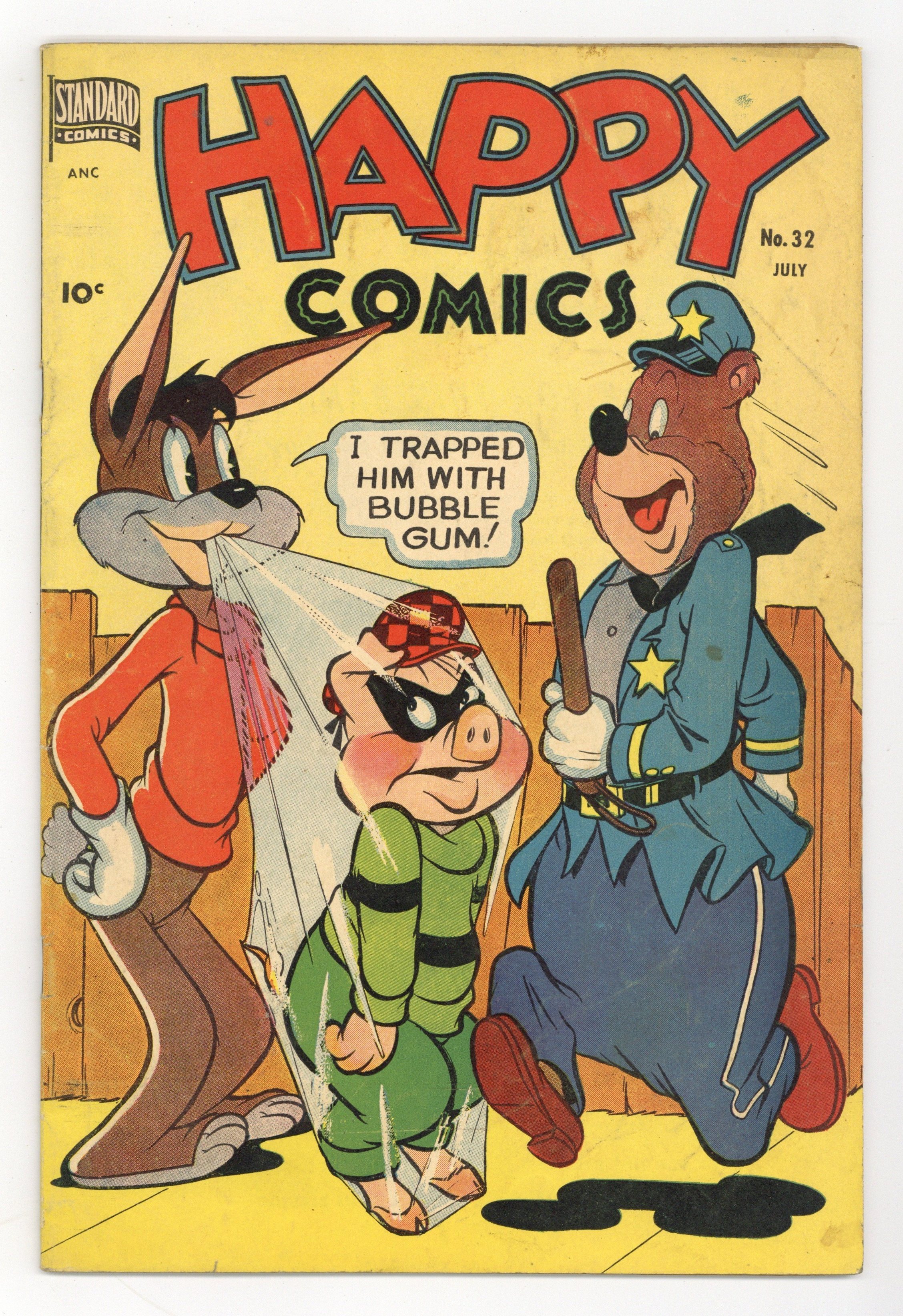 36 page issues begin. Contains Frank Frazetta comic story art ("Bruno Bear in 'The No Hound'") and two Frazetta text story illustrations. Frazetta text story illustrations appear in eighteen consecutive issues of Happy Comics (1943) (#20-#37) and in sixteen consecutive issues of Goofy Comics (1943 Nedor/Standard) (#20-#35). Contains funny animal stories. In order of appearance: "Happy Hare and the Foozleberries"; "Bruno Bear in 'The No Hound'" art by Frazetta; "Uncle Fuzzy Hare in 'The Spectre Scarecrow'"; "Happy Hare" by Vincent Fago; "Happy Fairy Tales, Real Fairy Tales From the Classics: The Brave Little Tailor" art by George Roussos; and "Phineas the Parrot". Illustrated text stories: "Herbie: This Little Insect Gets His Chance to Shine!" by Betty Cummings, illustration by Frazetta; and "Miserable Mouse: Poor Mortimer Thought That Nobody Liked Him!" by Elizabeth Starr, illustration by Frazetta. 36 pages. Full color. Cover price $0.10.