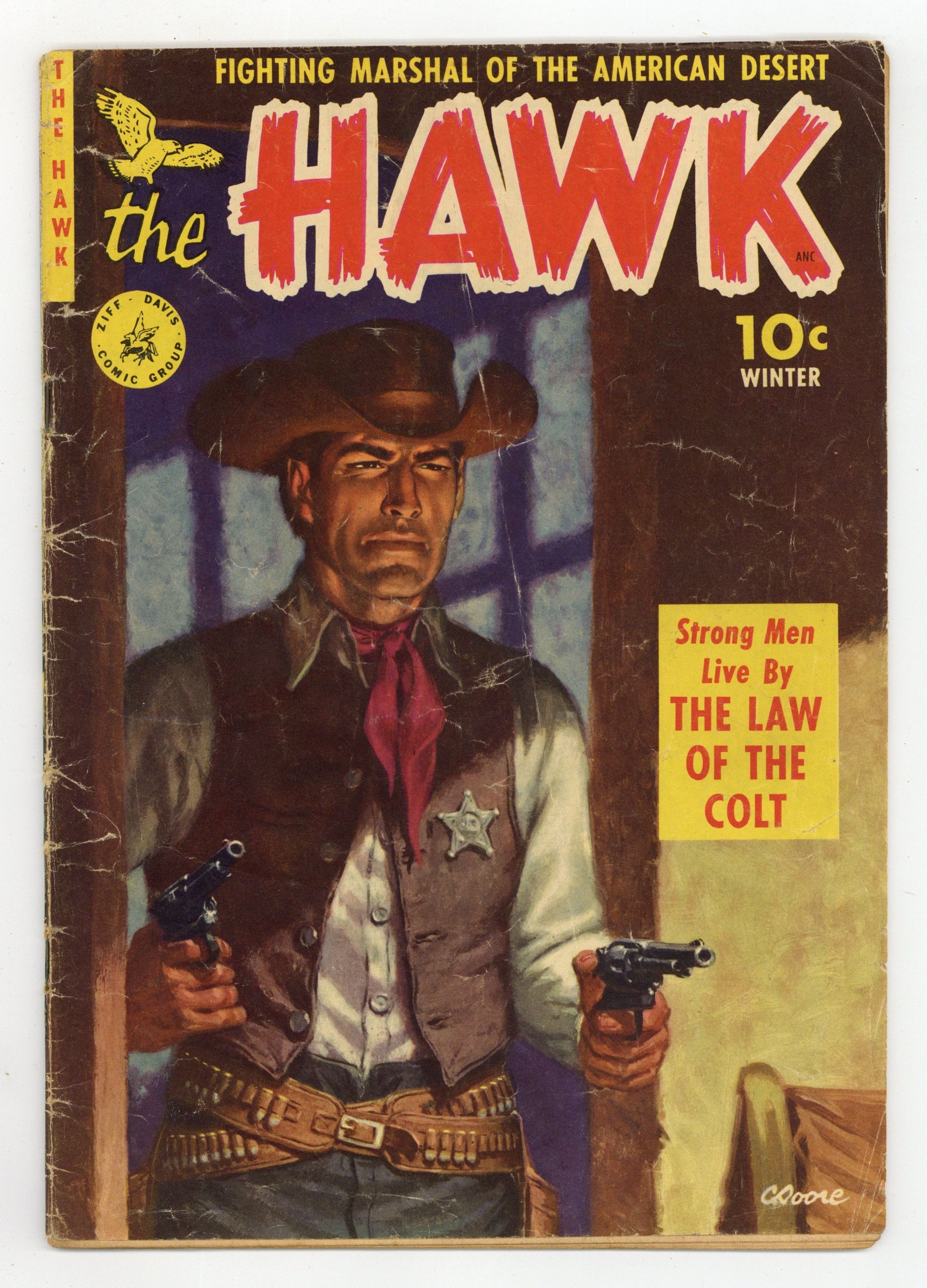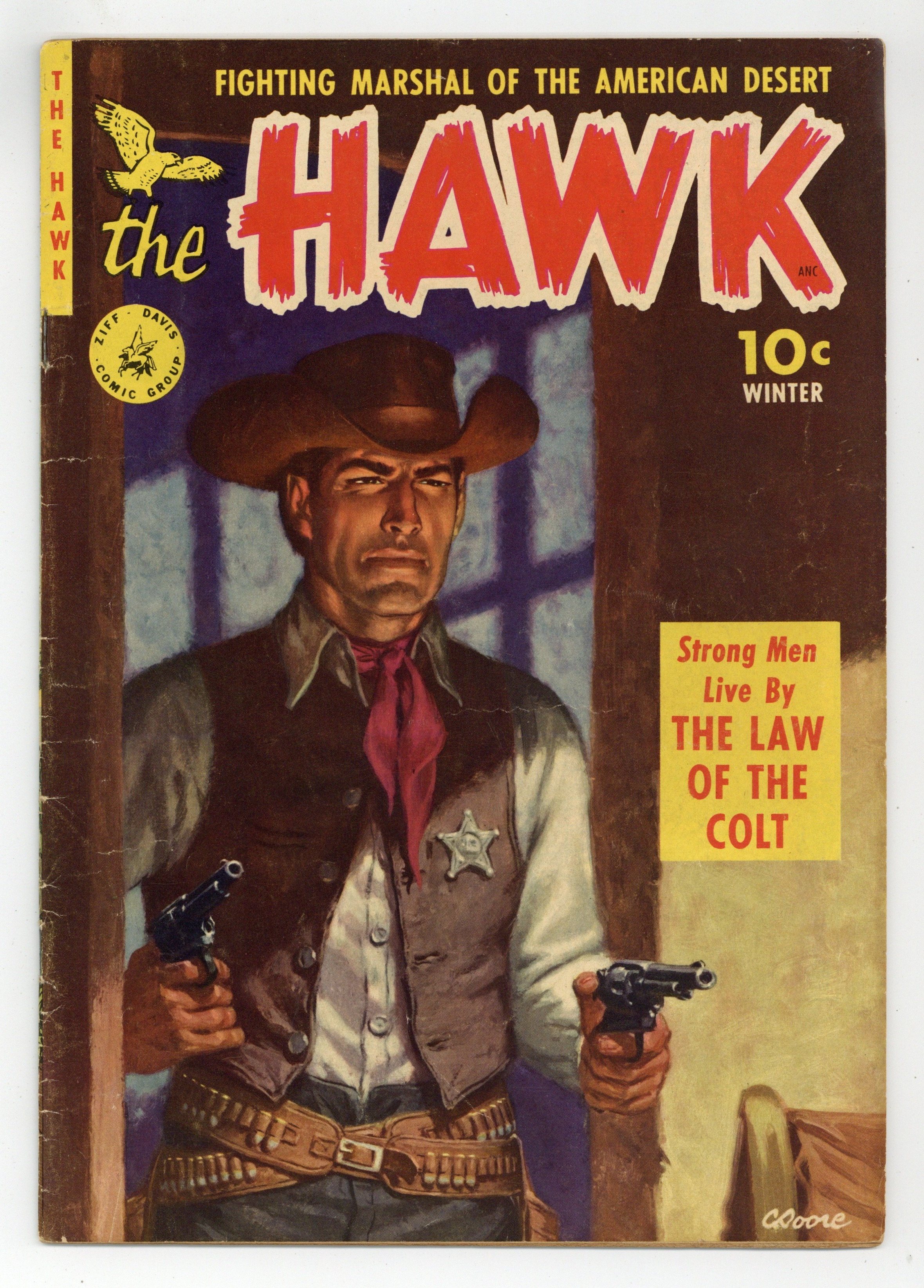 Published Dec 1951 by Ziff Davis.$68.00Cover by Clarence Doore. Stories and art by Dan Barry, Murphy Anderson, George Tuska, Ed Silverman and Alex Kotzky. Tough marshal Bob Hardie is better known to friend and foe alike as The Hawk. The lawless town of Adobe Bend must change after Marshal Bob "Hawk" Hardie rides into town, but outlaw Slash hires Lobo Moreno to get rid of The Hawk. Marshal Hardie arrives in Armadillo Flats and goes after Reb Sutton and his band of killers. Pajaro, new chieftain of the Mescaleros, declares war on white settlers, but his blood brother Sangre tries to convince him otherwise, in a story with art by comics legend Murphy Anderson. Plus the lyrics to the Western tune "Billy Venero" and a comics biography of Walter Scott, the man known as "Death Valley Scotty." Nice painted cover by Clarence Doore. Death Valley Scotty; The Law of the Colt; Cowboy Songs of the Old West: Billy Venero; A Fair Exchange; Six-Gun Showdown; Ghost Towns of the Old West: Cripple Creek; Blood Brothers; The Great American Desert. 32 pages, Full Color. Cover price $0.10.