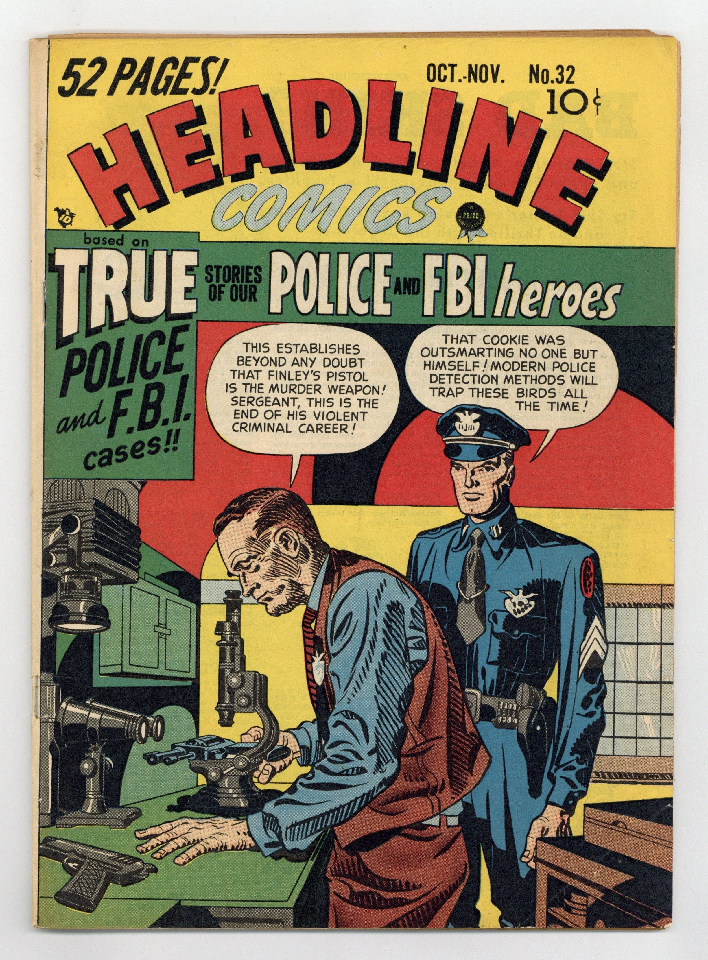 Cover by Jack Kirby. Stories and art by Vic Donahue, Joe Simon and Jack Kirby. Headline Comics featured the lurid, hard-edged crime dramas then in vogue, many by Captain America creators Joe Simon and Jack Kirby. Treasury agents crack a counterfeiting ring; A tale of murder in rural America that may be EC legend John Severin's first published work; The gangster known as "King of the Everglades" runs amuck in Florida between 1915 and 1924. How the T-Men Broke A Cunning Counterfeit Team; The Mystery of Room 712; The Clue of the Horoscope; A Grave Crime; G-Man Blitz; Trapping the Ashley-Mobley Gang (Terror of the Everglades). 52 pages, Full Color. Cover price $0.10.