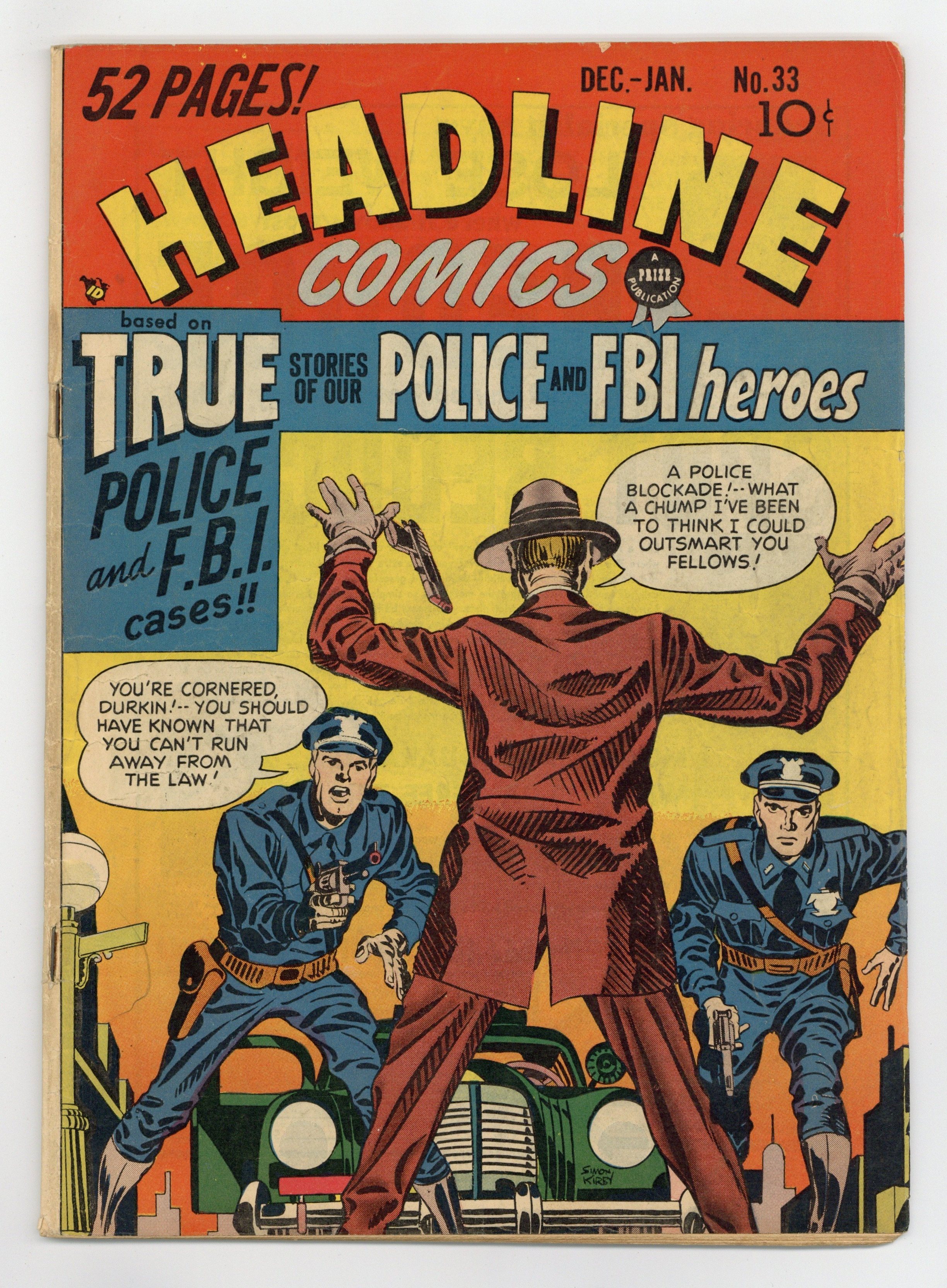 Cover by Jack Kirby and Joe Simon. Stories and art by Will Elder, Manny Stallman, Vic Donahue, Joe Simon and Jack Kirby. Headline Comics featured the lurid, hard-edged crime dramas then in vogue, many by Captain America creators Joe Simon and Jack Kirby. A British swindler plots to steal an ocean liner in 1912; A story with early art by EC legend Will Elder; A crook plays a dangerous game by preying on other crooks. Premeditated Homicide!; The Man Who Stole An Ocean Liner!; The FBI and the Gun Happy Robber; How The FBI Trapped the Booby Trap Slayer; A Mother's Ominous Dream!; What Price Fate? ; The Shattered Alibi; Underworld Parasite! 48 pages, Full Color. Cover price $0.10.