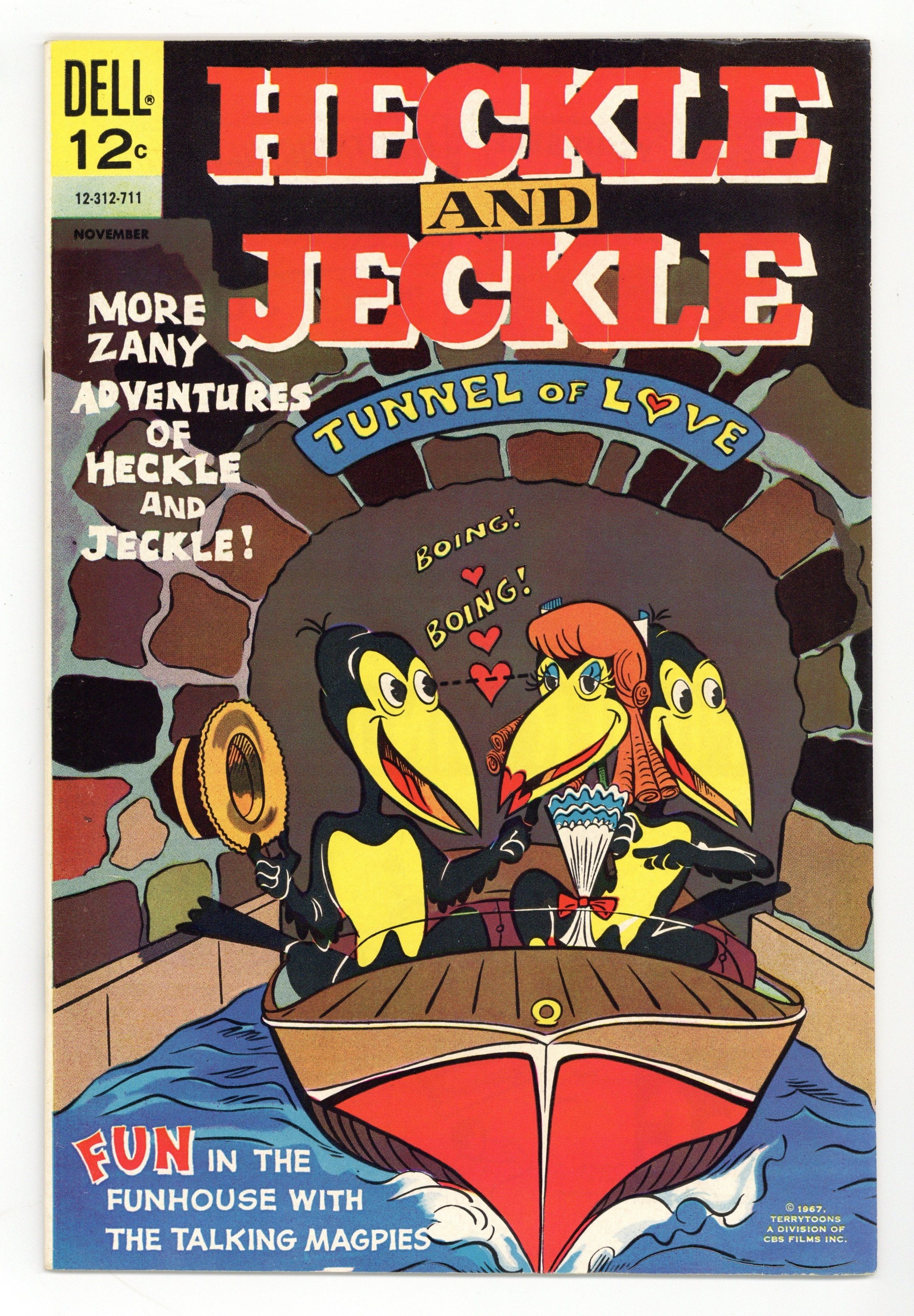 Talking magpies Heckle and Jeckle are known for their identical appearance, their distinctive chatter, and their mischievous schemes. A carnival owner offers Heckle and Jeckle a season pass if they can get rid of a bully who's terrorizing the other fairgoers. Heckle and Jeckle get the brilliant idea to prospect for gold in Alaska. Dimwit may be dull, but he should really know better than to buy an air conditioner from Heckle and Jeckle. A Wild Ride!; Terry Bears; The Forty-Ninth State; Gandy Goose: Haunt Hunting; Little Roquefort; Dinky Duck: The Easy Life; A Really Good Deed! Final issue of the series; the canny magpies appeared next as the stars of New Terrytoons (1962 Gold Key) #1. 32 pages, Full Color. Cover price $0.12.