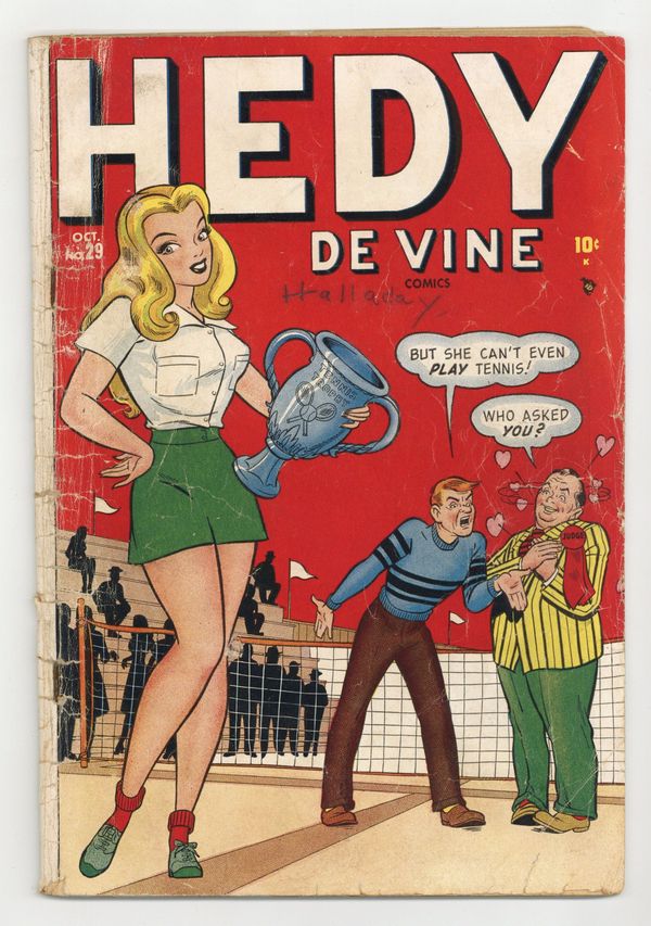 Stories by Harvey Kurtzman (Hey Look! 1-pagers) and unknown. Art by Harvey Kurtzman (Hey Look! 1-pagers) and unknown. Hedy De Vine stars in: "I Hate People"; "American Beauty"; "Scene But Not Seen"; and "Publicity Poor"! Also in this issue: 2-page text story "Newspaper Man"; Millie the Model in "Smoke Rings the Bell"; Tessie the Typist in "Tessie's Test"; and two untitled Hey Look! 1-pagers by Harvey Kurtzman. 48 pages, full color. Cover price $0.10.