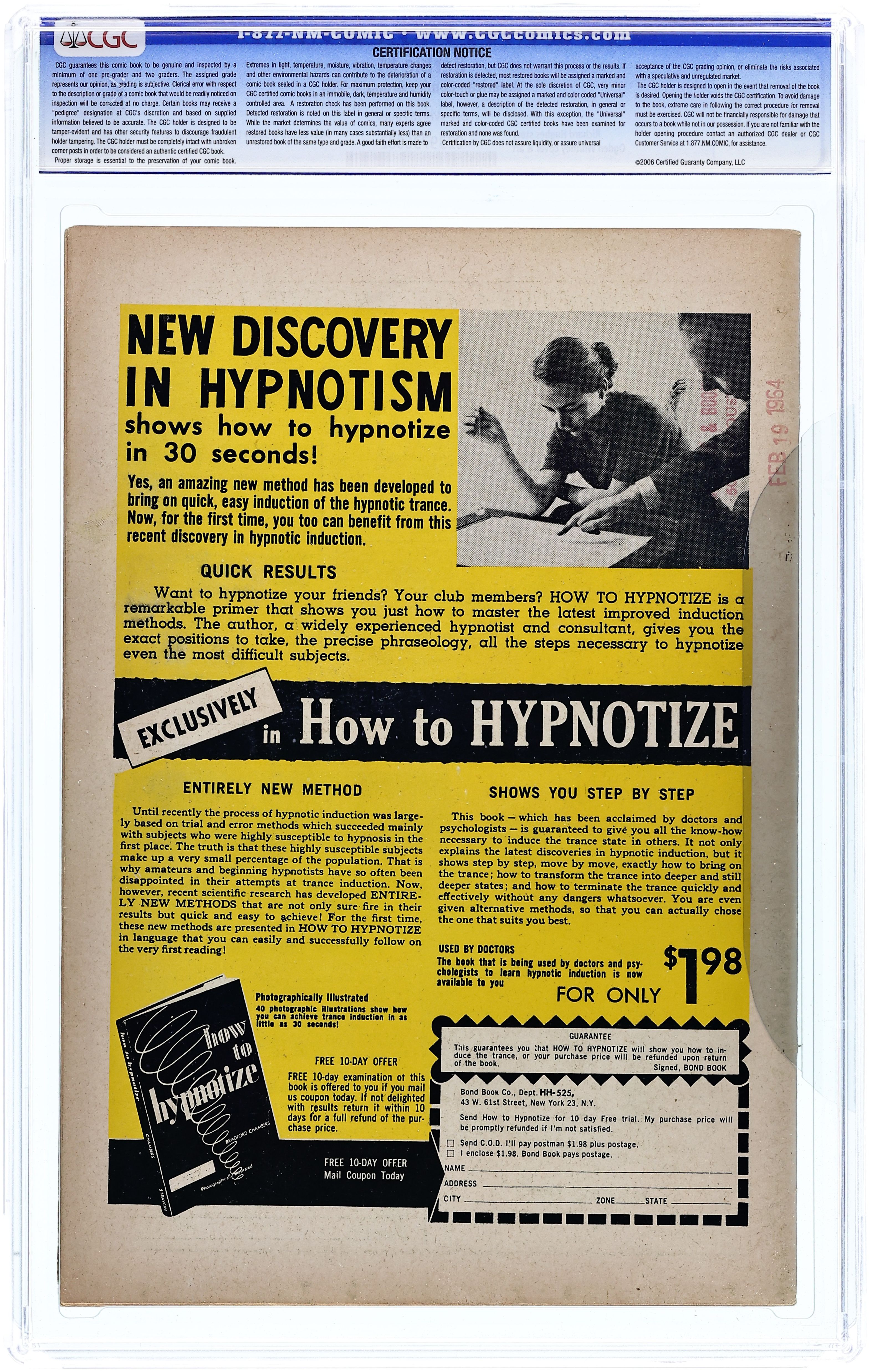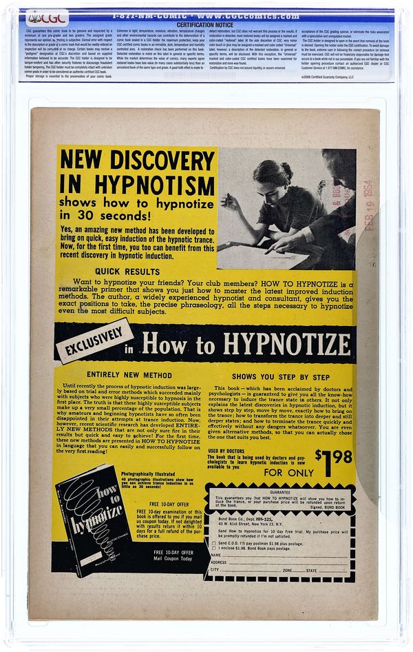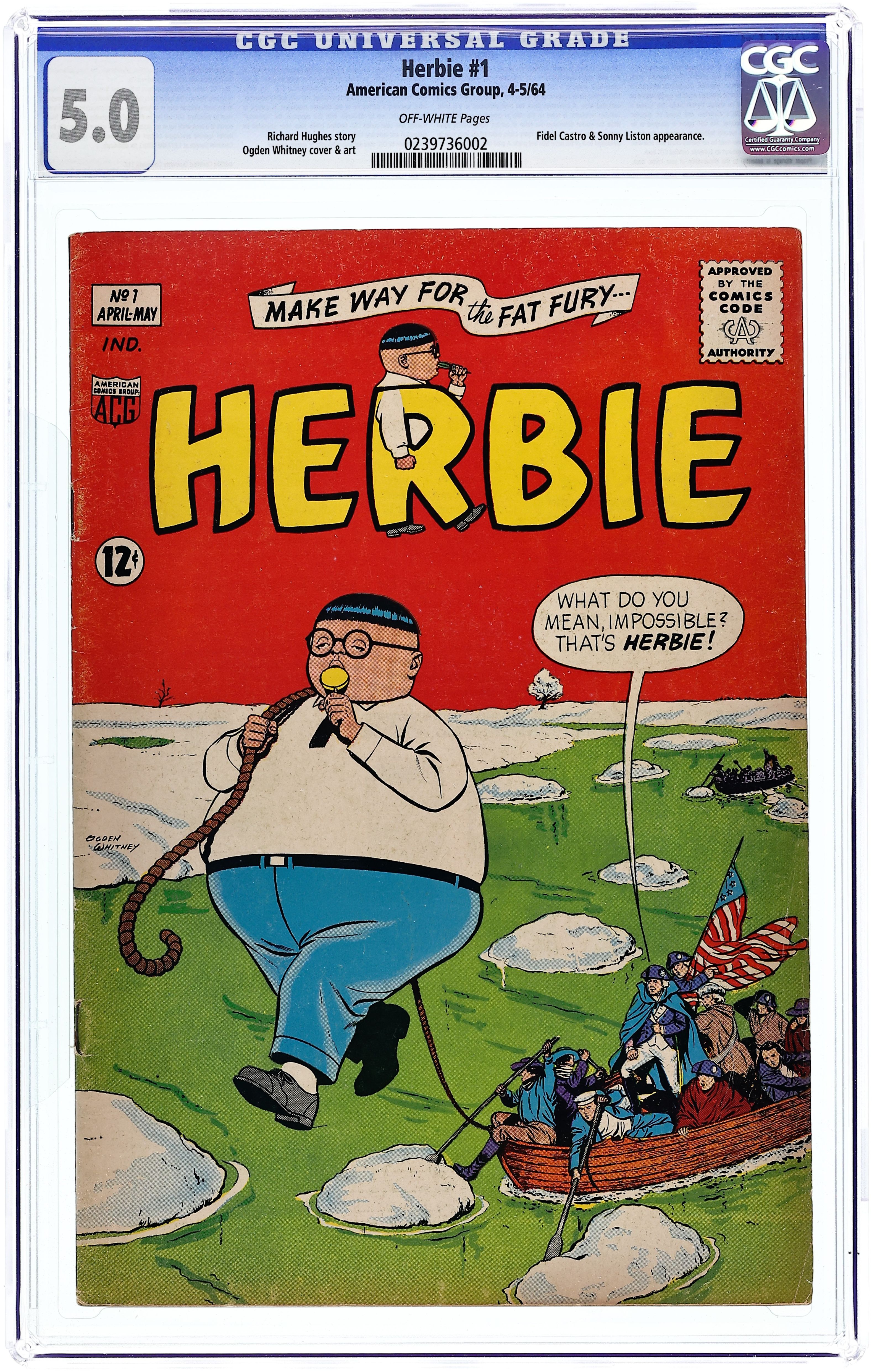 Cover art by Ogden Whitney. Herbie and the Dragon's Tears!, script by Richard E. Hughes [as Shane O'Shea], art by Ogden Whitney; President Johnson needs Herbie's help to beat Russia into space; Herbie goes back in time to Medieval England; He gets into a magic contest with Merlin the Magician before pursuing his real goal of bringing back the base for a miraculous rocket fuel: dragon's tears. The Triumph of Eibreh Rekcenpop! text story. Herbie Beards Castro!, script by Richard E. Hughes [as Shane O'Shea], art by Ogden Whitney; Herbie's family goes to Florida to see Sonny Liston box; Herbie ends up boxing Liston to help win money for the ransom of the kidnapped head of the Cuban underground; Ultimately, Herbie has to go to Cuba to rescue the prisoner personally. 36 pgs. $0.12. Cover price $0.12.