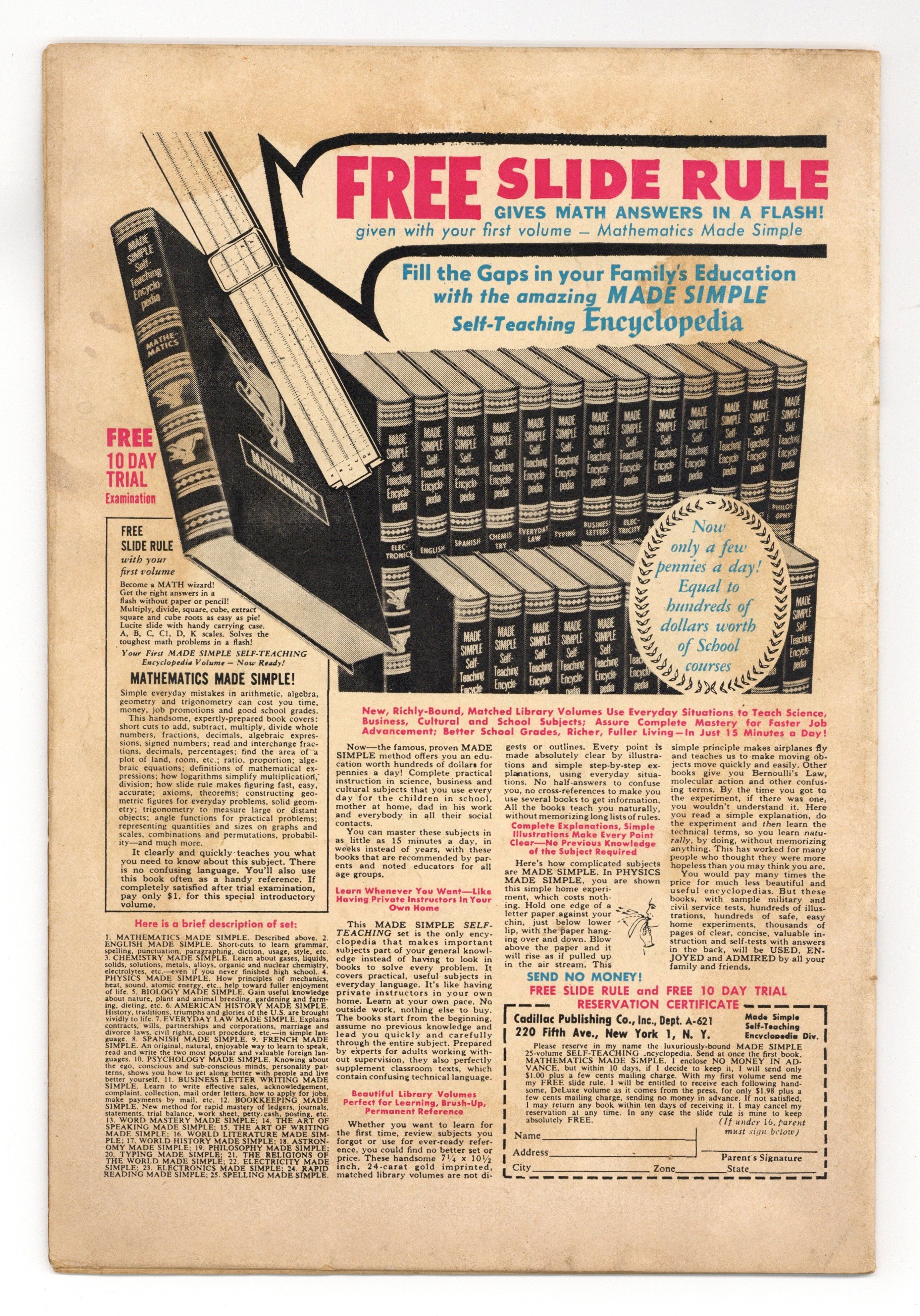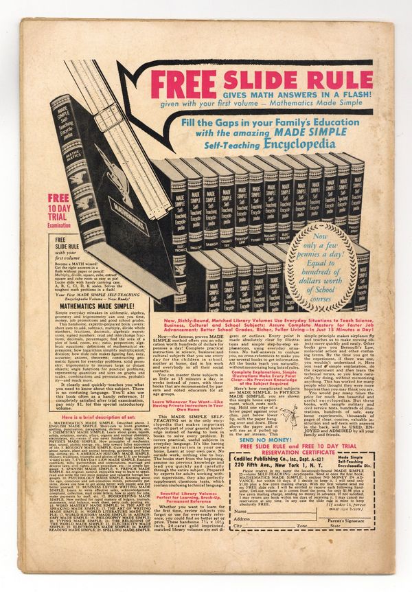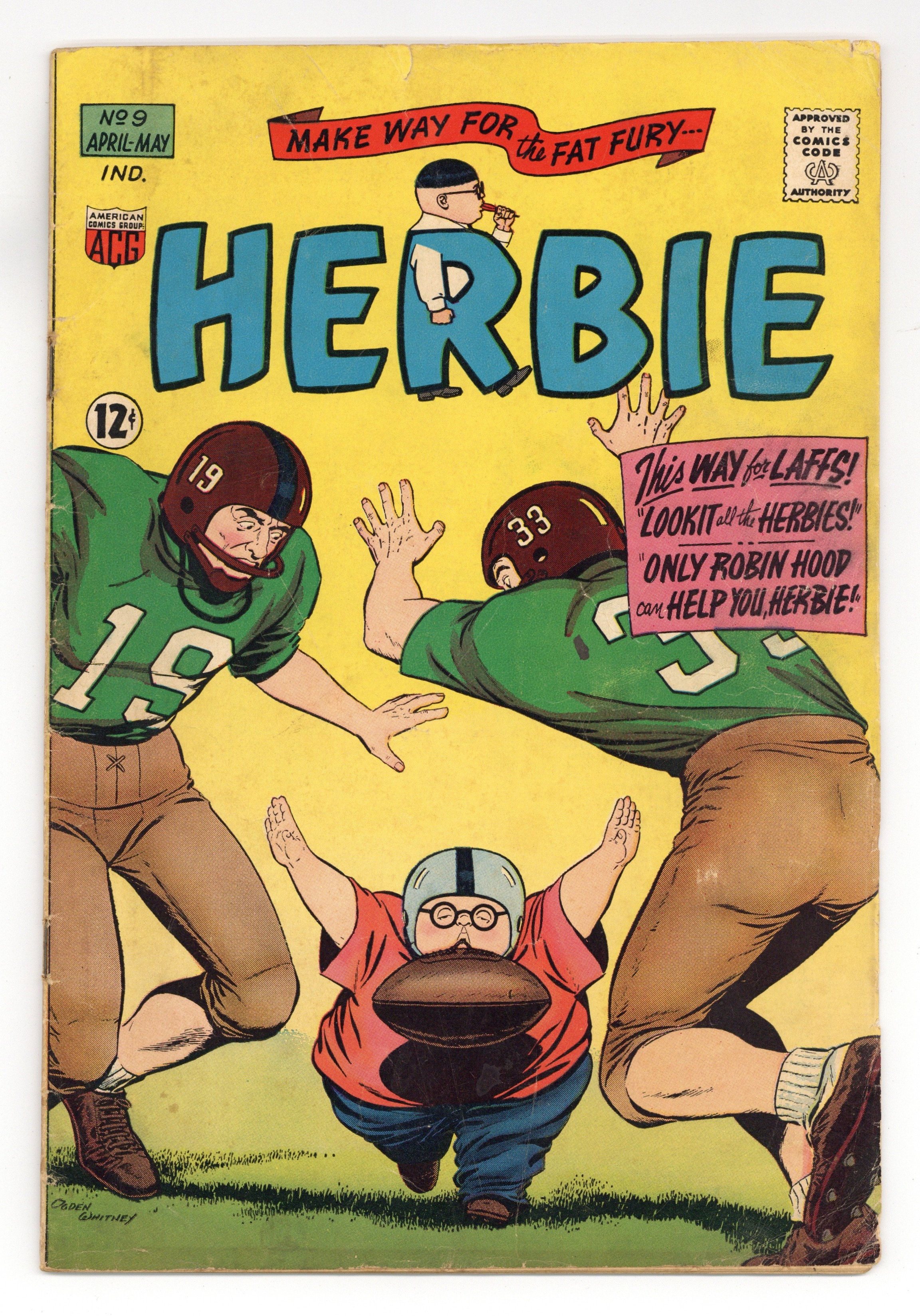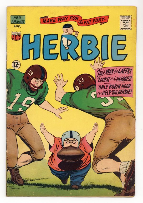 $18.00Cover art by Ogden Whitney. Lookit All the Herbies!, script by Richard Hughes (as Shane O'Shea), art by Ogden Whitney; Herbie's neighbor, Professor Flipdome, creates the Automatic Imitator, which creates many duplicates of Herbie. Swami O'Toole breaks out of prison and tries to use Herbie's love of lollipops against him, but Herbie's doubles come to the rescue. Only Robin Hood Can Help You, Herbie!, script by Richard Hughes (as Shane O'Shea), art by Ogden Whitney; Herbie's dad thinks Herbie is a great archer and enters him in the Robin Hood Tournament. Herbie goes back in time to get Robin Hood's bow. 36 pgs. $0.12. Cover price $0.12.