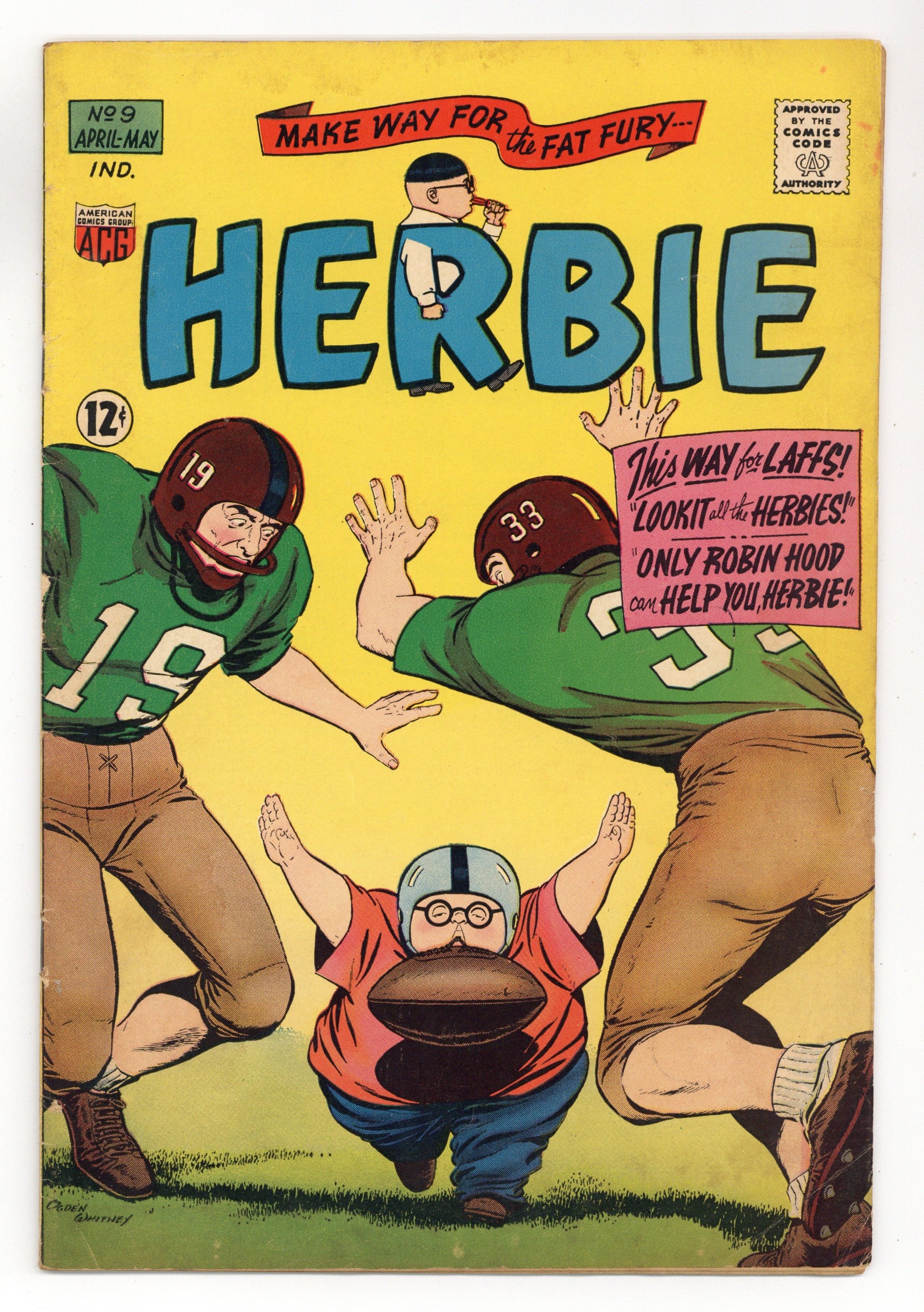 Starts Jan 3 Cover art by Ogden Whitney. Lookit All the Herbies!, script by Richard Hughes (as Shane O'Shea), art by Ogden Whitney; Herbie's neighbor, Professor Flipdome, creates the Automatic Imitator, which creates many duplicates of Herbie. Swami O'Toole breaks out of prison and tries to use Herbie's love of lollipops against him, but Herbie's doubles come to the rescue. Only Robin Hood Can Help You, Herbie!, script by Richard Hughes (as Shane O'Shea), art by Ogden Whitney; Herbie's dad thinks Herbie is a great archer and enters him in the Robin Hood Tournament. Herbie goes back in time to get Robin Hood's bow. 36 pgs. $0.12. Cover price $0.12.