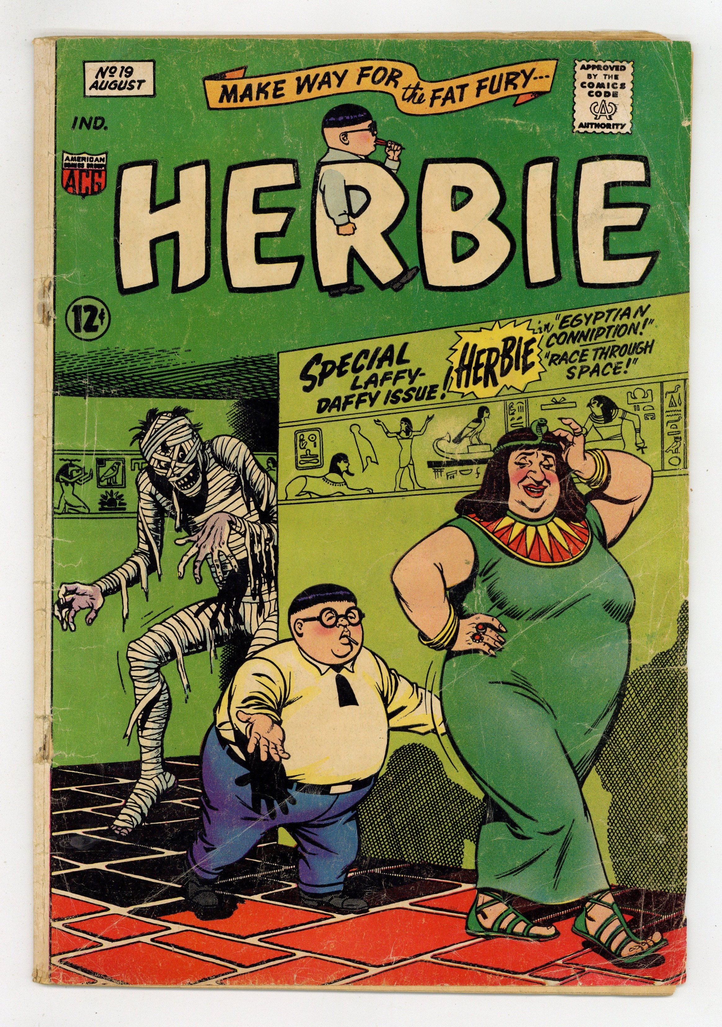 Cover art by Kurt Schaffenberger. Race through Space!, script by Richard Hughes (as Shane O'Shea), art by Ogden Whitney; To win money to build a swimming pool, Herbie gets his father to enter a space race; When Herbie finds that his neighbor, Professor Flipdome is away, he builds his own rocket and gets his animal friends to power it. Herbie races Black Bumby, who does his best to stop Herbie's rocket; Egyptian Conniption!, script by Richard Hughes, art by Ogden Whitney; Herbie's dad loves Elizabeth Taylor as Cleopatra and tells Herbie to get her; Herbie hears wrong and goes back in time to get the real Cleopatra, who falls in love with Dad. 36 pgs. $0.12. Cover price $0.12.