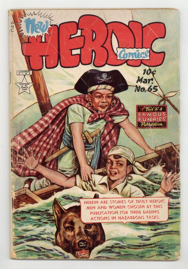 Published Mar 1951 by Famous Funnies.$17.00Painted cover by Henry Kiefer. Stories and art by Frank Frazetta, Al Williamson, Ed Moore, Bill Walton, Tony DiPreta, Harold LeDoux, and Ruth Atkinson. Non-fiction comics featuring true tales of heroism from everyday people and courage on the battlefield. A 10-year old boy saves a young friend from drowning, featuring early art by comics legends Frank Frazetta and Al Williamson. High school students think fast after a freak accident sends fire shooting across a street. Two children free a third from an avalanche of sand. Thankless Job; Runaway Rescue!; Jars Popped Fire Stopped!; Fireman of the Year!; Modest Cop; Heroine by Habit; Housewife Heroine; Burned Child; The Frightened Hero; Situation Well in Hand; The 3 Students and the Flaming Oil; Brother Saves Sister; Sunny's Sunday; Sailor Saved; Hero of the Highway; Barber in Hairbreadth Rescue; The Boy in the Water; Grid Star Hero; Hero Team; Four Saved - 3 by Boy Scout; Sand Slide; Coast Guard Auxiliary Hero. 48 pages, Full Color. Cover price $0.10.