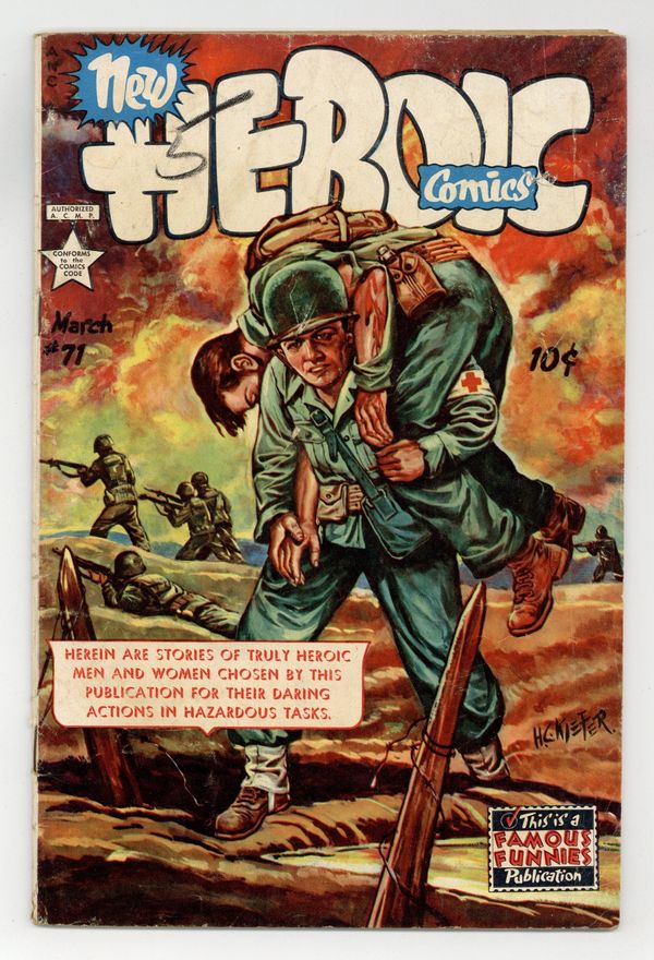 Painted cover by Henry Kiefer. Stories and art by H. G. Peter, Harold LeDoux, and Frank Frazetta. Non-fiction comics featuring true tales of heroism from everyday people and courage on the battlefield. Heroic Comics resumes its focus on wartime heroics as the Korean War gets into full swing. Lt. Frederick Henry wins the Medal of Honor in World War II, and a soldier sacrifices his life so his squad can escape, both featuring early art by comics legend Frank Frazetta. A wounded medic carries other injured soldiers to safety across a deadly battleground. Battleground Hero; Little Man-Sized Hero; Sewer Rescue; Jimmy Flynn Jumps in; Milks Life into the Dying; Triumph Over Death; Safety Patrol Hero; Newsboy Delivers; Gave Life to Save Lives; Frank Bukovsky National Hero; Heroism Is Their Hobby; Fire in the Night; He Stayed Behind. 32 pages, Full Color. Cover price $0.10.