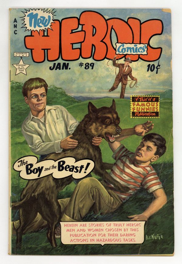 Published Jan 1954 by Famous Funnies.$8.80Painted cover by Henry C. Kiefer. Stories and art by Jim McArdle, Ed Moore, and John Belfi. Non-fiction comics featuring true tales of heroism from everyday people and courage on the battlefield. A projectionist keeps his head and evacuates a theater full of children without causing a panic. An 11-year-old boy rescues a child from an attacking dog, in a story (and cover) with some truly scary imagery. A medic is injured during heavy fighting in Korea. Attack; Rescue from the Sky; Dangerous Territory; Bomber Ablaze; The Medic and the Marines; Added Attraction; The Heroic Leader; Camouflage; Night Attack; A Girl Against the Sea; The Boy and the Beast. 32 pages, Full Color. Cover price $0.10.