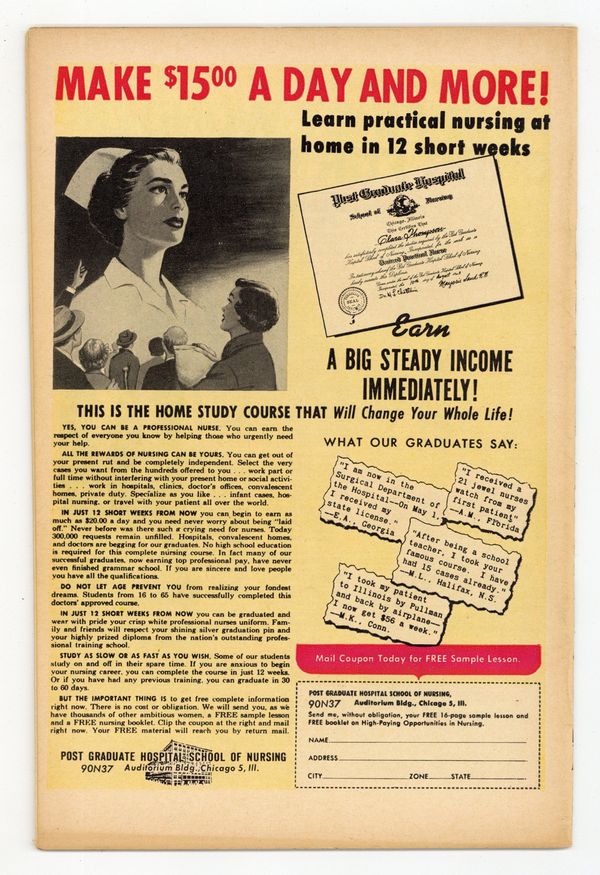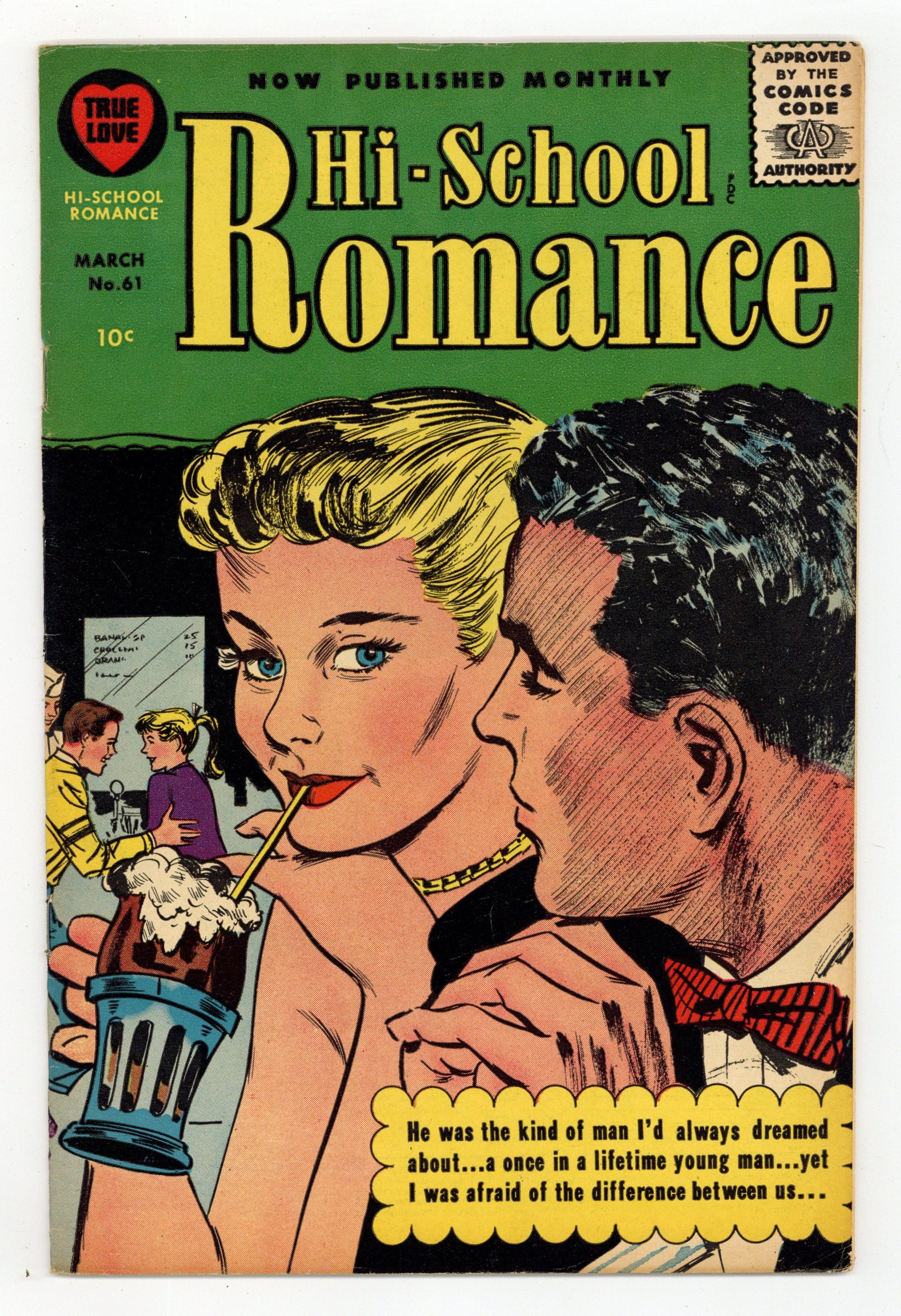 $29.00Cover art by Al Avison. Too Young, art by Al Avison; Wendy and Eric meet on the beach during a New England summer; Following a whirlwind romance, they elope and marry. Lost Love; Even though Nancy Harris was a year younger, she planned to marry Ben Carter after high school. House ad promoting First Love 74, True Love Problems and Advice Illustrated 49, Hi-School Romance 61, First Romance 64, and True Bride-to-Be Romances 23. All in Fun; All Sandy can think of is applying to medical school, but Ginny Ross wants excitement; After breaking up with Sandy, Ginny starts seeing Bix, the wild, carefree guy with no ambition. Love Without Honor, art by Tom Hickey; Donna Blake was hopelessly in love with Bill Carson, but she was a plumber's daughter and Bill's father, Jeb, was a wealthy land developer. 36 pgs. $0.10. Cover price $0.10.