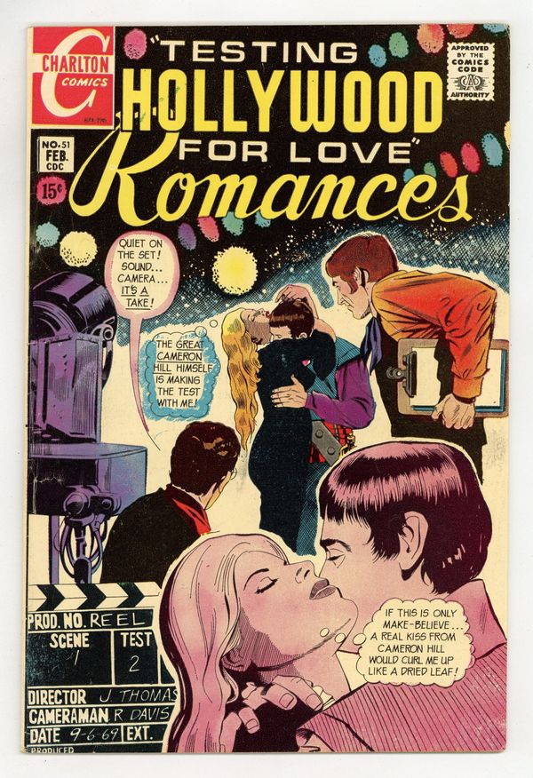 Published Feb 1970 by Charlton Comics Group.$14.00Stories and art by Angel Luna and others. Tales of love and heartbreak set against the background of Tinseltown. An aspiring actress makes it to Hollywood, and actually gets to film test footage with screen heartthrob Cameron Hill. Struggling actors find love, but will it last through the rise and fall of fame? Testing for Love; Empty Kisses and Broken Hearts; Just Jeannette; Born to Heartbreak! 32 pages, Full Color. Cover price $0.15.