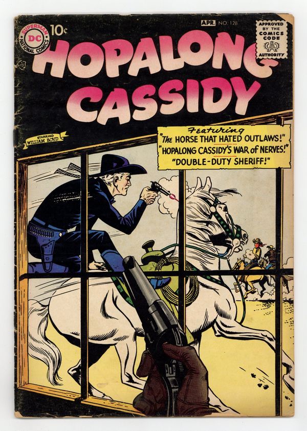 Cover by Gil Kane and Joe Giella. Stories and art by Gil Kane, Bernard Sachs, John Broome, Henry Boltinoff, and Joe Giella. Western adventure featuring one of the most popular heroes of the mid-20th century, star of TV, film and radio. An outlaw's horse (that thinks in thought balloons) rejects his rider to help Hopalong catch him, in one of three stories (and cover) this issue illustrated by future Marvel legend Gil Kane. Hoppy tries to figure out how an outlaw gang robbed the bank while they were still safely behind bars. Plus fun facts from Old West history. The Horse That Hated Outlaws!; Colorful Indian Names; Hopalong Cassidy's War of Nerves!; Sagebrush Sam; Arapaho Bands; Double-Duty Sheriff! 32 pages, Full Color. Cover price $0.10.