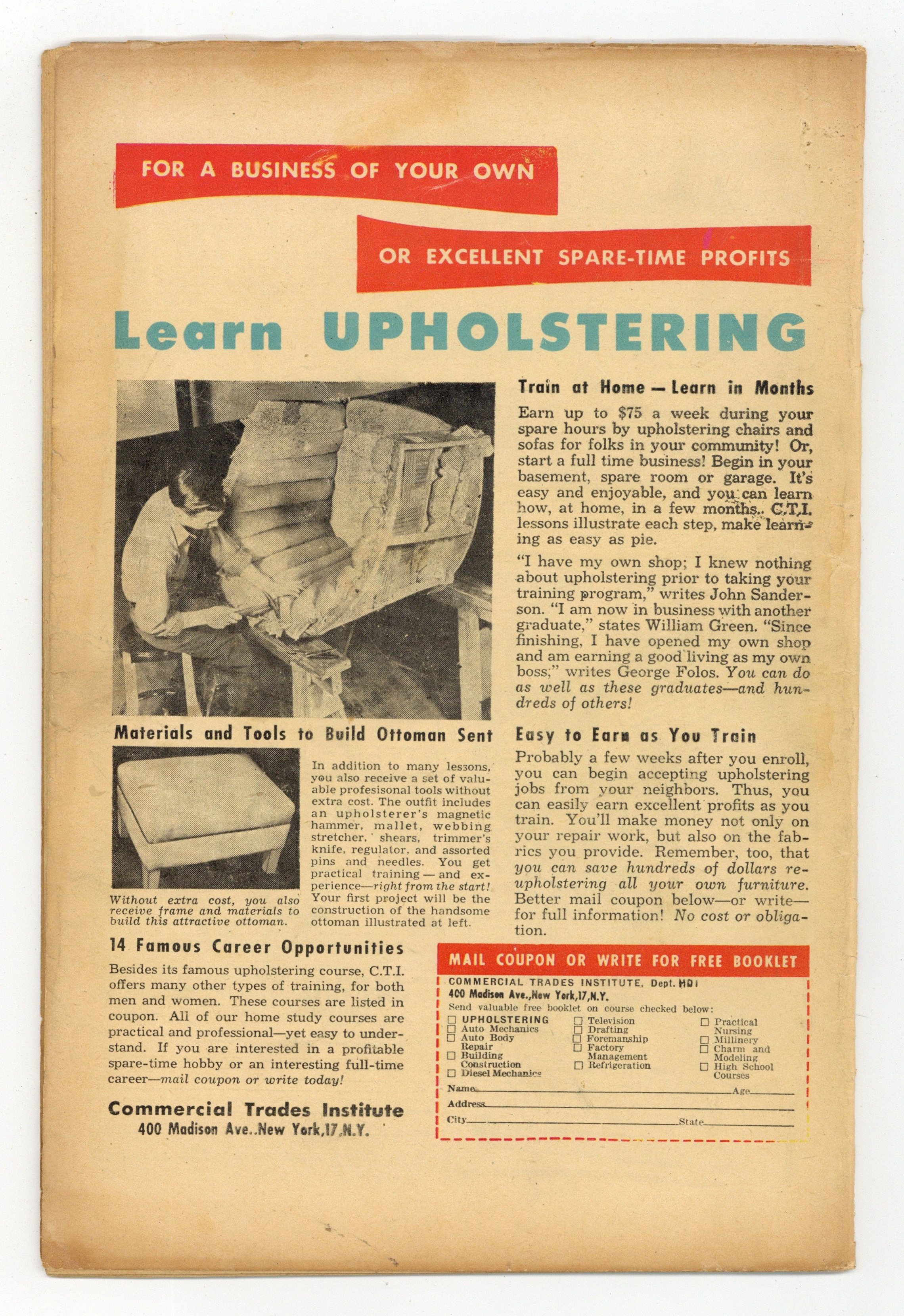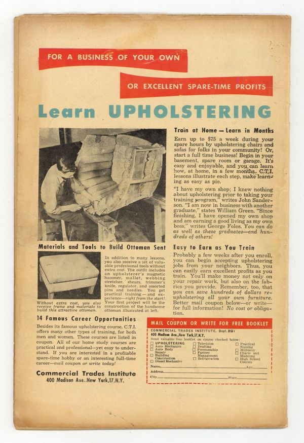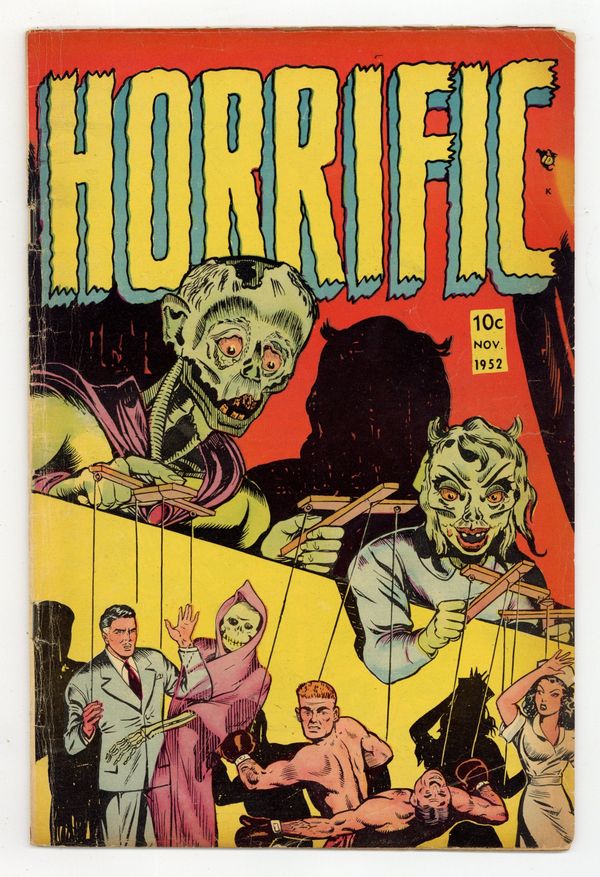 "Tail of Death"; Amos Hatter has to take care of his younger scientist brother, Joseph; The mentally deranged Joseph experiments with a growing formula, but finds the opposite and shrinks himself down to mouse size; Amos helps him to regain his normal size, but is murdered by Joseph out of fear to be submitted to a mental institution. "Terror On High"; Two criminals infiltrate a monastery in the Bavarian Alps, where the bodies of the dead are preserved in its sub-zero cellar; Ralph and Jerry steal precious gems from the corpses and make their escape to their hide-out cabin; But the ghosts of the robbed come for revenge. "The Bony Shadow" text story by Brett Thompson. "The Clay Coffin"; Sculptress Hortense Hollingsworth creates things of beauty, but is homely herself; When husband Grover starts flirting with the new maid, Hortense poisons her and makes her into a statue. "The Vengeful Corpse"; Fisherman John Penn murders old Silas Barnes for his gold; He dumps the body at sea. Penn panics, however, when the corpse turns up in his fishing net. 36 pgs., full color. Cover price $0.10.