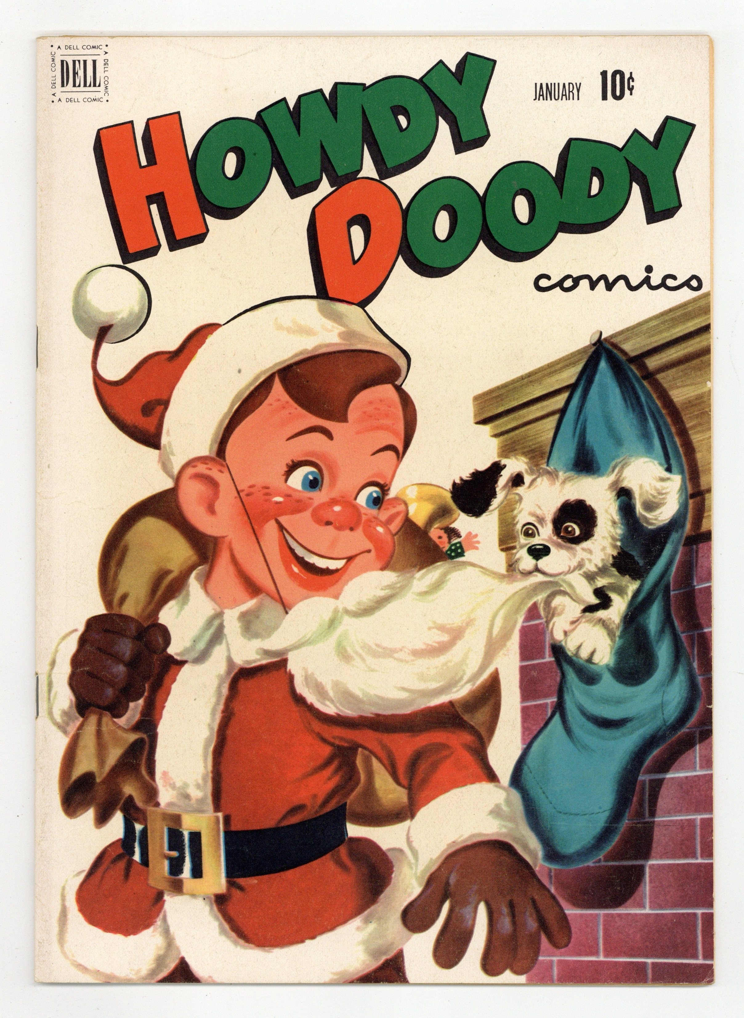 Cover pencils by Dan Gormley. "Howdy Doody's Christmas Eve" text story, art by Dan Gormley. Untitled story, script by Edward Kean, art by Dan Gormley; Howdy thinks he's found oil on Mr. Bluster's property. Untitled story, script by Edward Kean, art by Dan Gormley; Howdy and Dilly go shopping for a Christmas tree. Untitled story, art by Dan Gormley; Howdy and Dilly meet a homesick Eskimo who wants to go back to the North Pole. Untitled story, script by Edward Kean, art by Dan Gormley; Dilly tries, unsuccessfully, to get rid of a pesky mouse; In desperation, he finally puts up a "For Sale" sign on his house and heads down the road…with the mouse hitching a ride on his suitcase! 36 pages, full color. Cover price $0.10.