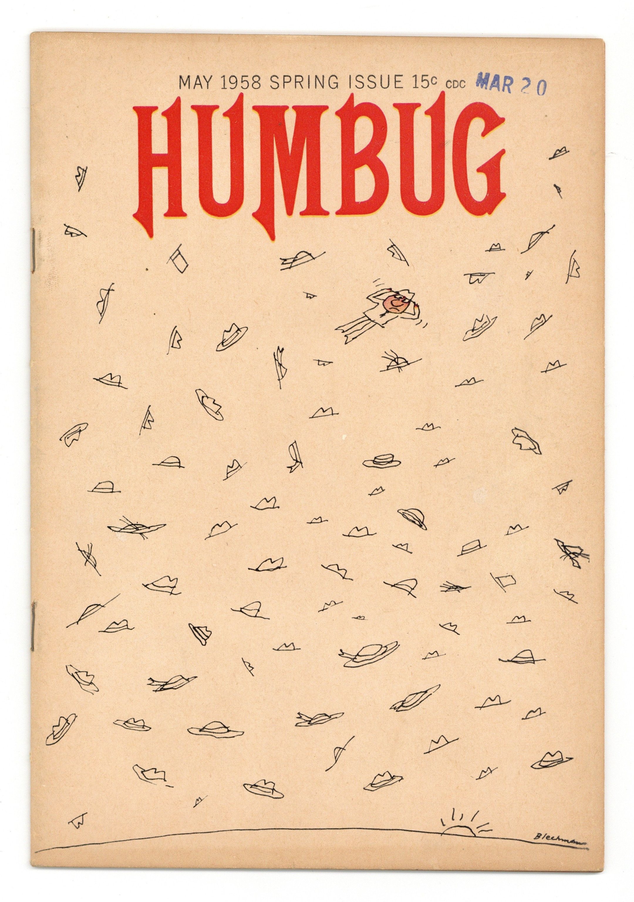 Cover by R. O. Blechman. Stories and art by Harvey Kurtzman, Bill Elder, Jack Davis, Al Jaffee, Arnold Roth, Larry Siegel and Ed Fisher. Another attempt by Harvey Kurtzman to duplicate the success of Mad magazine, Humbug was actually published by the artists who created it. Parodies of 1950s government-issued instruction manuals and science fiction comics. Auto racing in the 1950s. Satirical looks at TV commercials, Spring Training, and Saint Patrick's Day. Contributions from many past and future MAD Idiots, including Bill Elder, Jack Davis, Al Jaffee, and Arnold Roth. The Best Television Commercials 1958; Log of the Solar Hawke; Finding the Mummy; Crossing Death Valley; Prof. Jughead's Educational Corner; Basic Field Manual: U.S. Armnaviators Handbook; Sport Car Racing; Diving for Pearl; Finding a Souvenir; The Little Goldy Book; The Humbug Award: Panicky Patriots; Spring Training; Adhesive Bandages; A Quiet Night. 32 pages, B&W. Cover price $0.15.