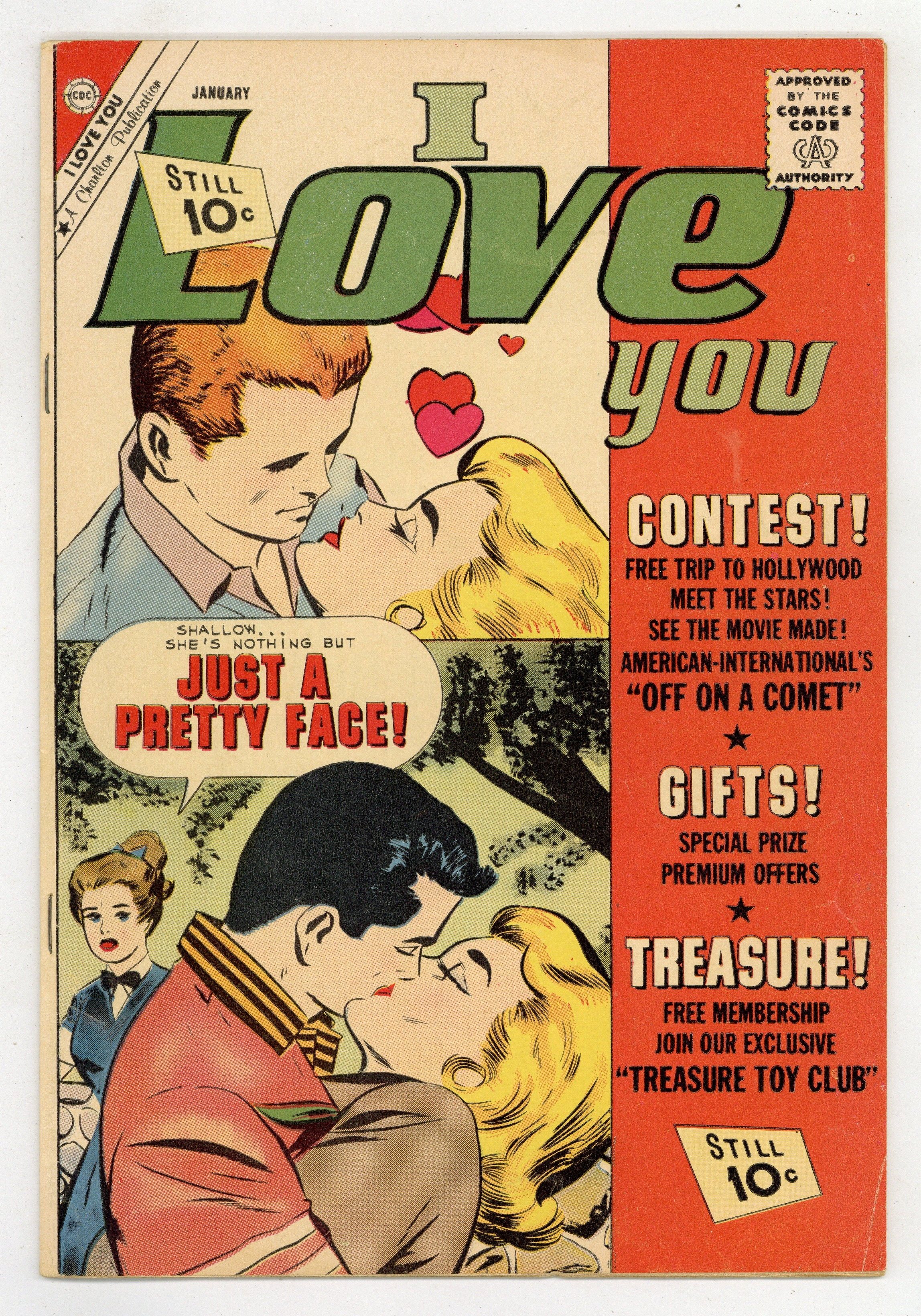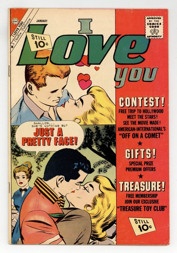 Cover by Joe Sinnott and Vince Colletta. Stories and art by Joe Sinnott, Vince Colletta, Sal Trapani and Charles Nicholas. Charlton's long-running romance title showcased the fashions and relationship ideals of its rapidly changing eras. Vicki doesn't suspect that new beau Jim is part of the construction crew that she's got a running argument with. Debbie gets attention for her looks, but wants someone to desire the real Debbie, in a story with early art by future Fantastic Four legend Joe Sinnott. Ethel takes the extreme measure of wearing Hollywood-style makeup so she isn't bothered by men who think her beautiful. Nan and Art meet during the Korean War, then are separated during a skirmish. Romance Under Construction; Beauty Backwards; Just a Pretty Face; Lament and Learn; Life of Heartbreak. 32 pages, Full Color. Cover price $0.10.
