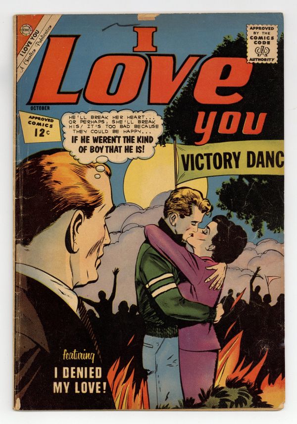 Cover by Joe Sinnott and Vince Colletta. Stories and art by Joe Sinnott and Vince Colletta. Charlton's long-running romance title showcased the fashions and relationship ideals of its rapidly changing eras. A girl starts dating the wrong kind of boy at the Victory Dance, and heartbreak is inevitable. Cynthy thinks she's found her match in wealthy yachter Vance, but then she learns he paid his rival Tom to stay away from her. Beautiful redheaded Betty can't wait to get out of her dead-end mining town, but even as a successful model in the city, she can't help thinking about Allan. Reunion; Men Meditate; High Price of Love; I Denied My Love! 32 pages, Full Color. Cover price $0.12.