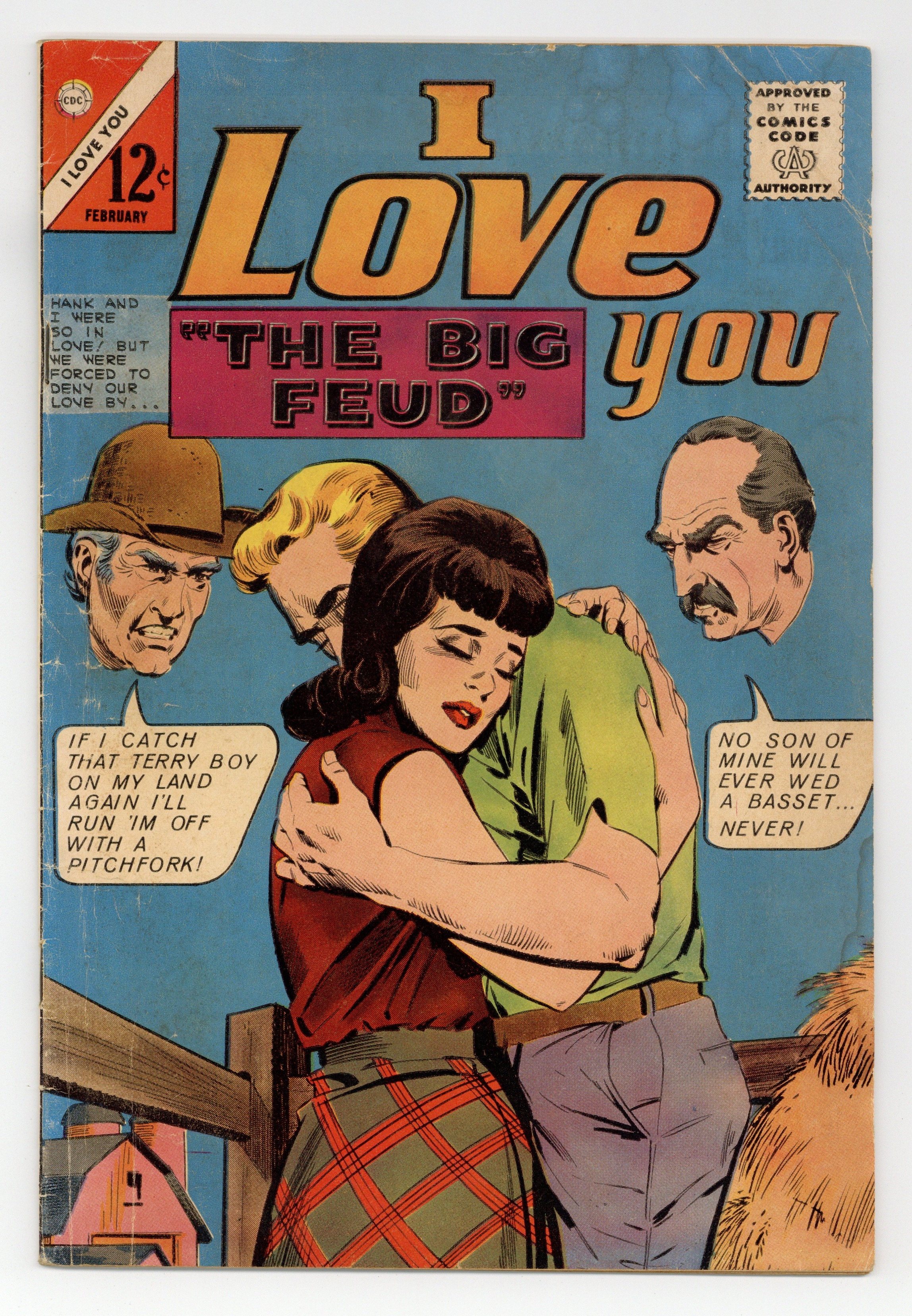 Cover by Dick Giordano. Stories and art by Tony Tallarico, Charles Nicholas and Vince Colletta. Charlton's long-running romance title showcased the fashions and relationship ideals of its rapidly changing eras. Jenny and boy-next-door Hank are in love, but a feud between their families gives them a Romeo & Juliet complex. Champion swimmer Myrna spends all her time underwater, but is socially awkward on the surface. Joan's promise to "never throw her arms around" Joe becomes ironic when he rescues her from a fire. Plus love advice to 1960s teenagers. The Big Feud; To The Loser Goes Love; Waterlogged Love; Til Love Returns; Canteen Corner; Karl's Angel; Life Saver. 32 pages, Full Color. Cover price $0.12.