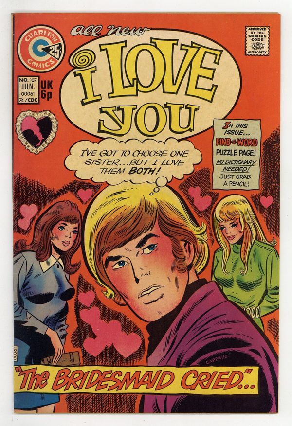 Published Jun 1974 by Charlton Comics Group.$8.00Cover by Art Cappello. Stories and art by Joe Gill, Tony Tallarico, Art Cappello, Vince Alascia and Charles Nicholas. Charlton's long-running romance title showcased the fashions and relationship ideals of its rapidly changing eras. A man must choose between two sisters he loves equally. Olga thinks she's being stalked, but George turns out to be a cop who's hunting the real stalker. A Quiet Place; Man in the Shadows; Find-a-Word; Teen-Age Troubles; The Bridesmaid Cried. 32 pages, Full Color. Cover price $0.25.
