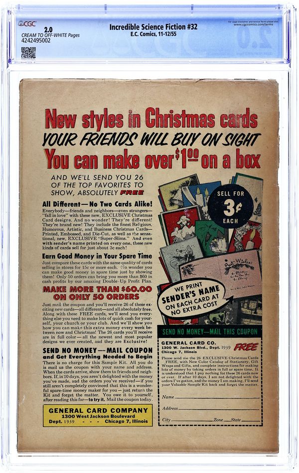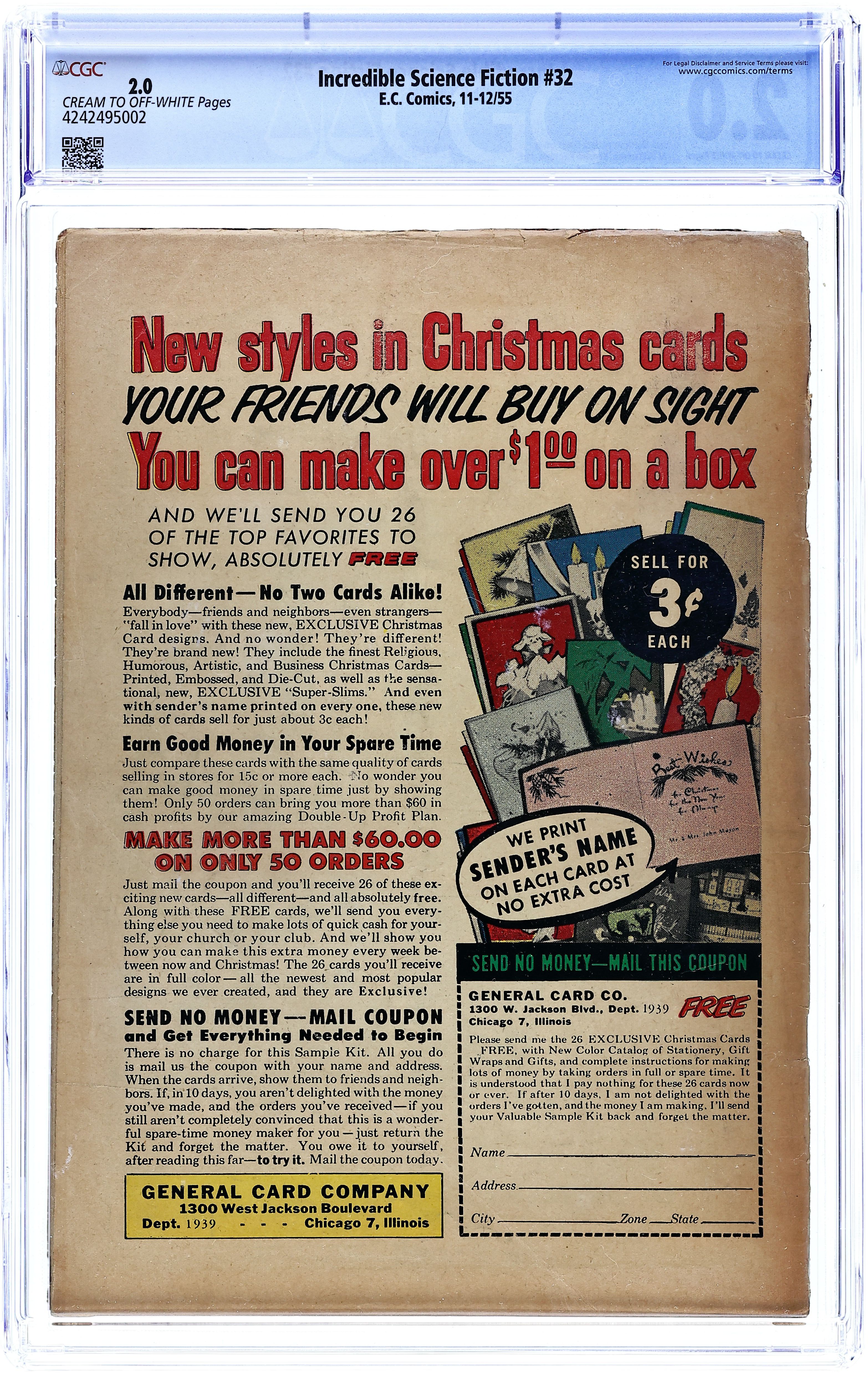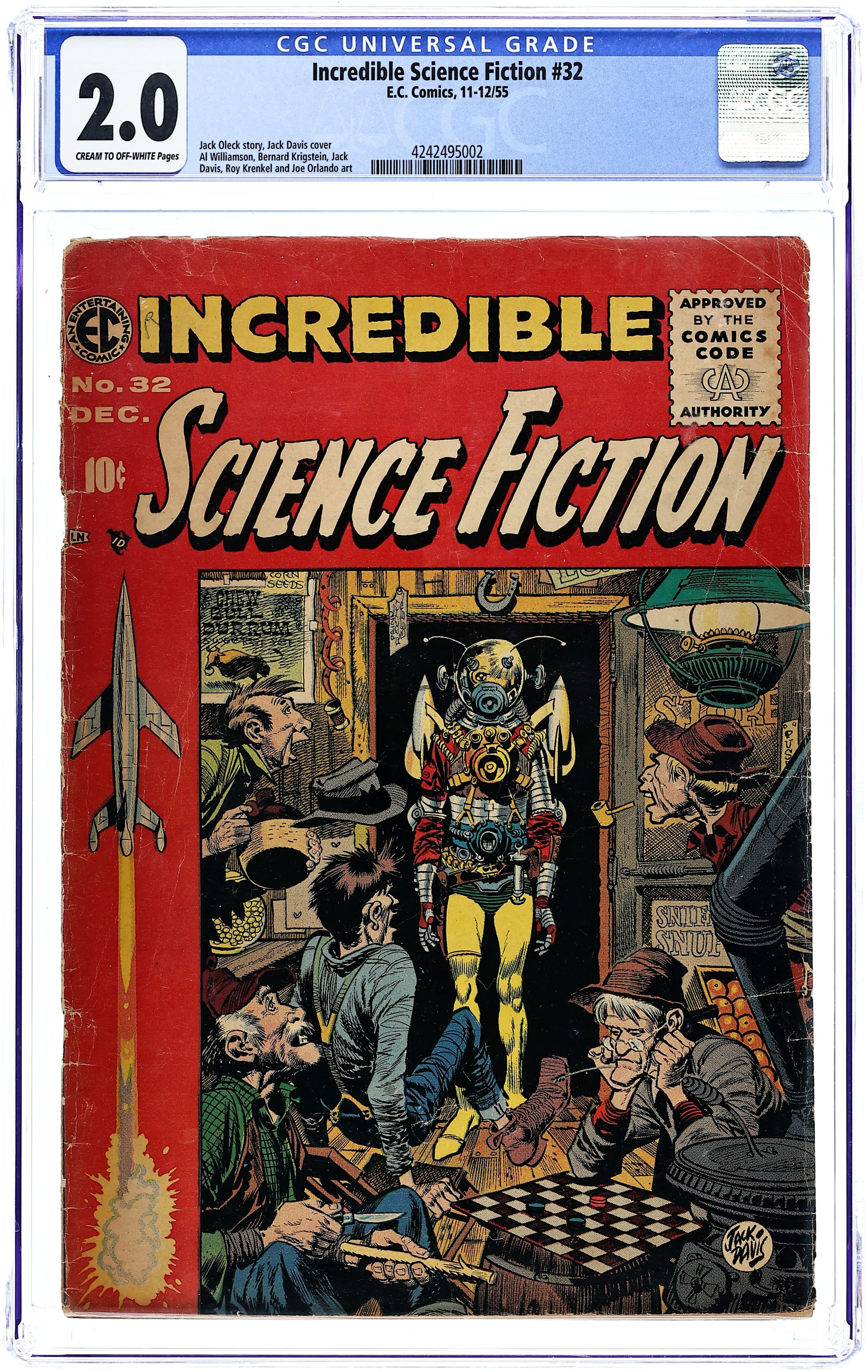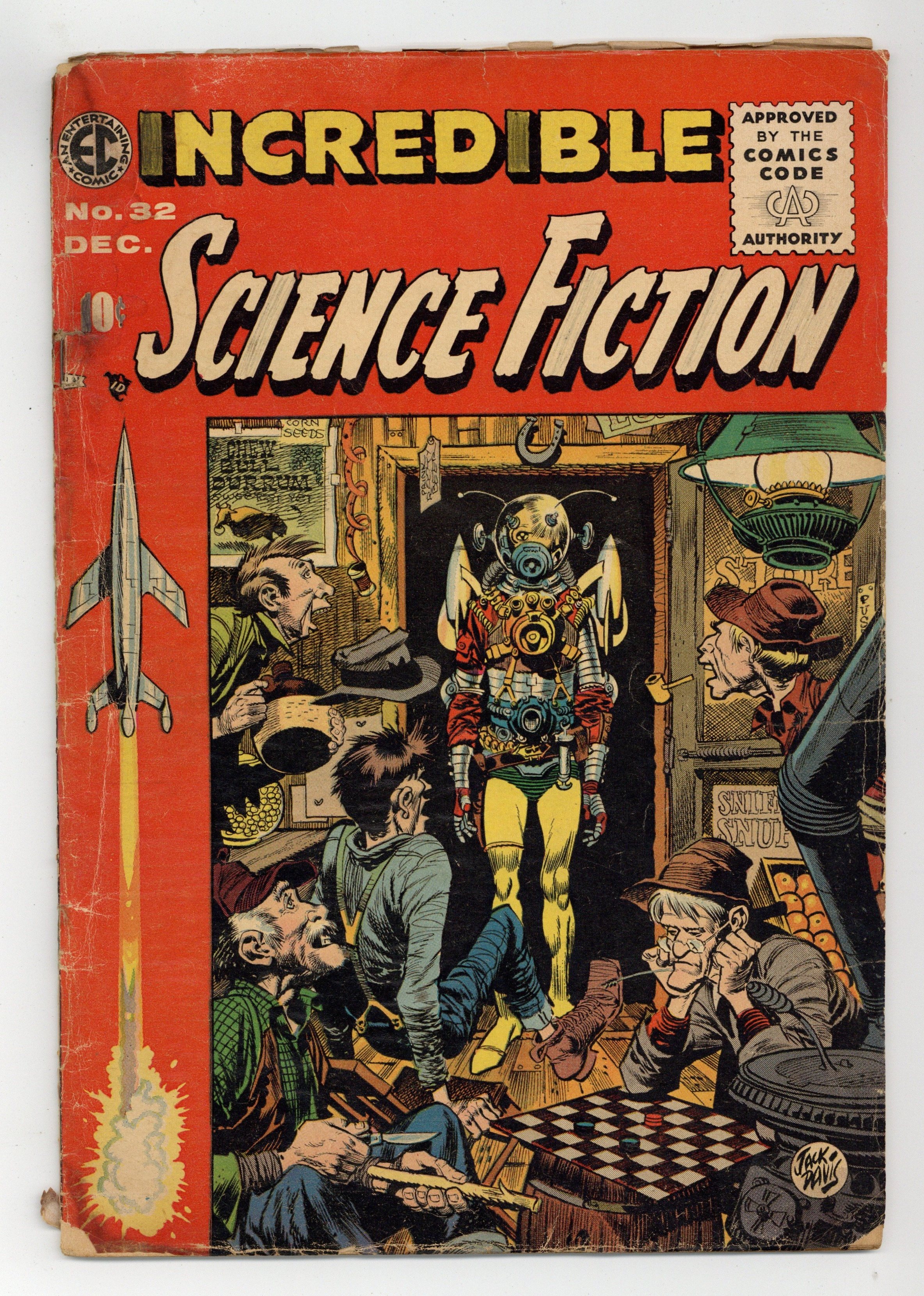 Cover by Jack Davis. Stories by Jack Oleck. Art by Jack Davis, Bernie Krigstein, Joe Orlando, Al Williamson, and Roy G. Krenkel. EC Comics changes its pioneering sci-fi title Weird Science-Fantasy to the Code-approved Incredible Science Fiction. A space captain faces court-martial, in a story by Jack Davis. Efforts at terraforming an alien planet have an unexpected result. A space tyrant sets his sights on familiar territory. Fallen Idol; Food for Thought; The Ultimate Weapon; Marked Man. 36 pages, Full Color. Cover price $0.10.