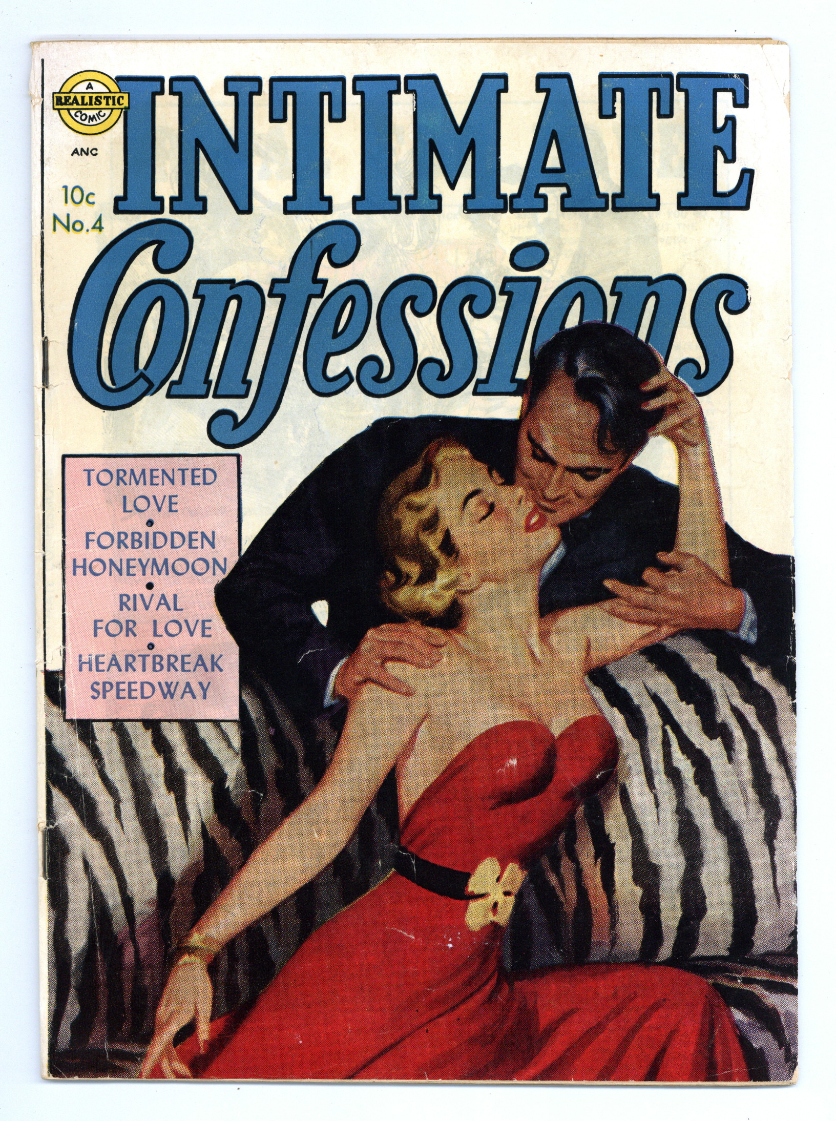 Art by Everett Raymond Kinstler, John Rosenberger, and Rafael Astarita. Tales of romance with lush, lurid covers reprinted from Avon paperbacks and a title that suggests more than the stories themselves. A woman is torn between her love for a race-car driver and perpetual fear for his safety; Karen compensates for her tragic childhood by keeping everyone at arms length, until she meets a man she cant forget; Rick and Kittys honeymoon is marred by a tragic accident and the reappearance of an old flame. Also featuring a nice contents page illustrated by Everett Raymond Kinstler on the inside front cover. Rival for Love; Forbidden Honeymoon; Heartbreak Speedway; Tormented for Love. 32 pages, Full Color. Cover price $0.10.